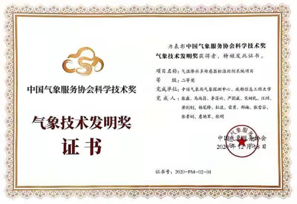 “气温降水多传感器标准控制系统项目”获中国气象服务协会科学技术奖气象技术发明奖二等奖