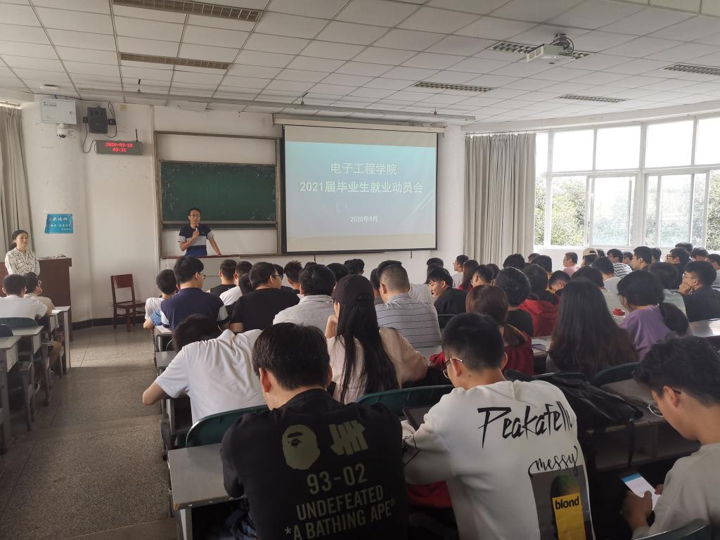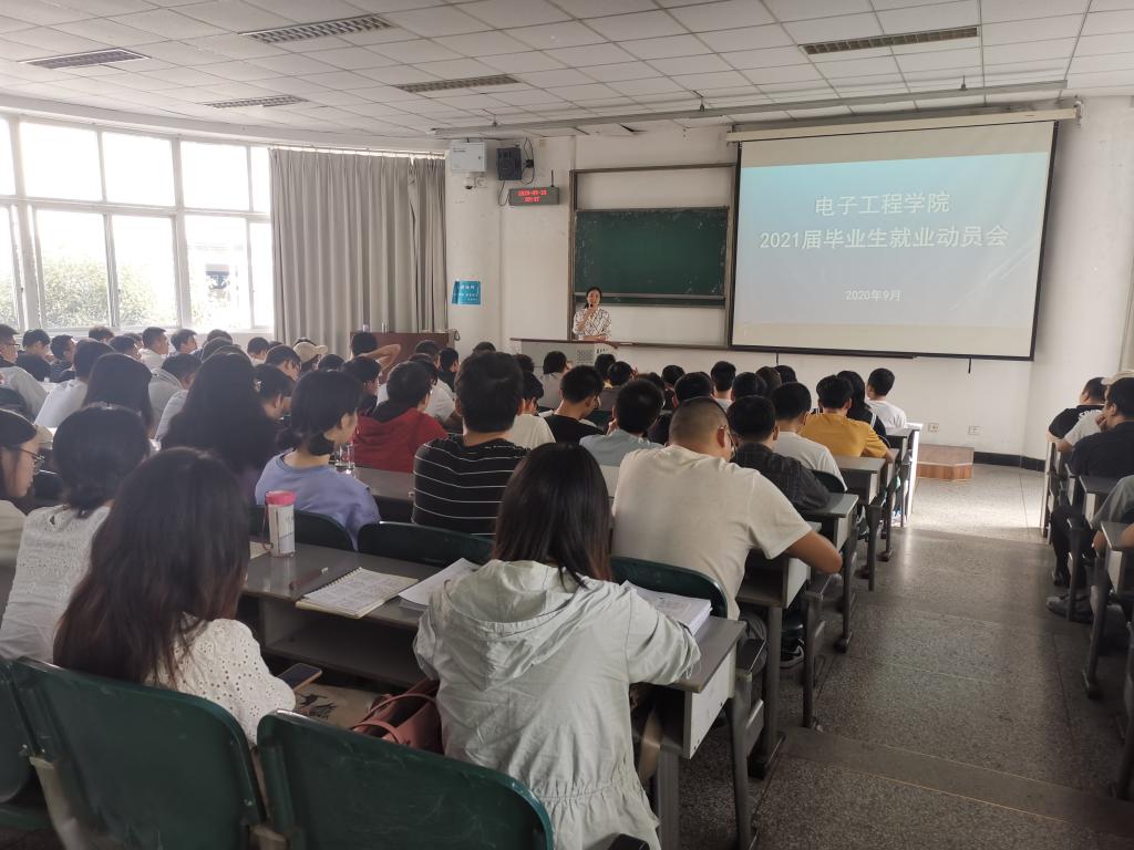 2020年9月18日上,电子工程学院在4213教室举办了2021届毕业生就业动员大会。学校招生就业处副处长李雅静、学院党委书记缪燕平、副院长张福贵、学生科科长阮丽娜、2021届毕业生全体辅导员以及2017级全体学生参加了本次大会。