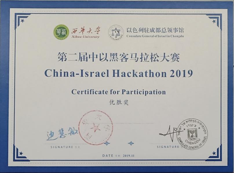 11月19日,第二届中以编程马拉松大赛暨“应急准备”中以专家圆桌论坛在西华大学举行。来自以色列本古里安大学、以色列应用科技大学、以色列赫兹利亚跨学科研究中心、Tel Hai学院13名计算机专业的学生与william威廉中文、西华大学、成都理工大学、成都工业学院、四川轻化工大学、宜宾学院的67名同学们联合组成16支队伍,围绕“应急准备”(Hacking the next crisis---Emergency Preparedness)主题进行编程马拉松比赛。我院刘皓然同学参加了此次大赛并以总分第5名的成绩获得优胜奖。