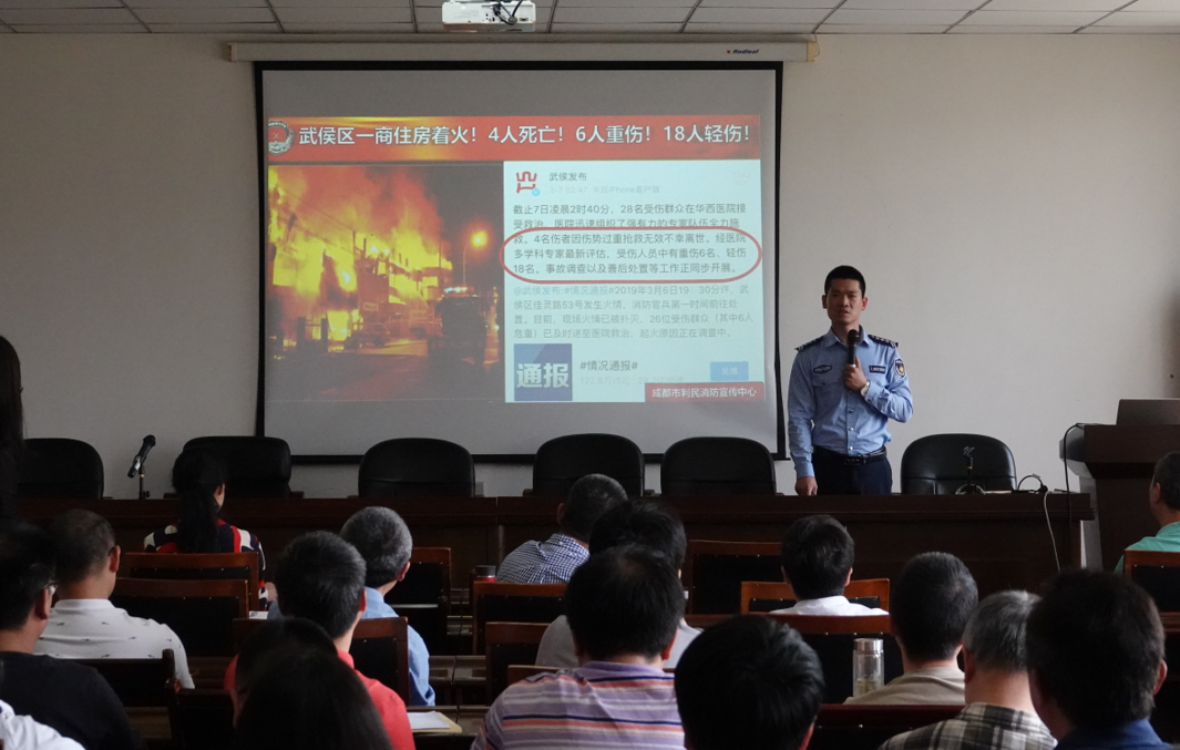 5月17日上午,成都市利民消防宣传中心李伟光教官在气象楼215会议室为我院教职工作消防安全知识讲座。讲座由学院党委书记缪燕平主持。