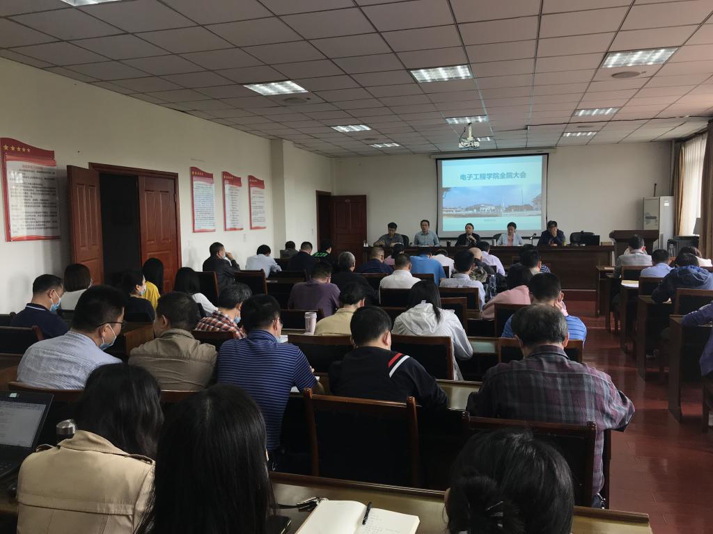 4月25日,电子工程学院在气象楼215会议室召开全院大会,学院党政领导班子及全体教职工参加了会议,会议由院长杨玲主持。