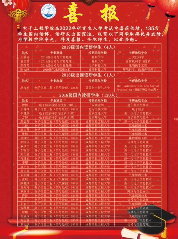电子工程学院在2022年研究生入学考试中喜获佳绩,135名学生国内读博、读研或出国深造,祝贺以下同学取得优异的成绩,为学校学院争光,特发喜报。全院师生,以此共勉。