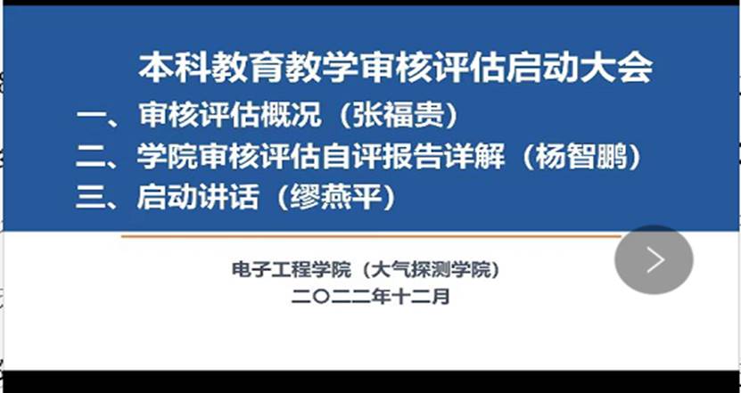 1218日,学校本科教育教学审核评估电子工程学院启动会以腾讯会议形式在线上举行,全院100余名教职工参加视频会议。会议对迎评工作进行安排部署,进一步统一思想、凝聚共识、形成合力,共同推进本科教育教学工作审核评估顺利开展。