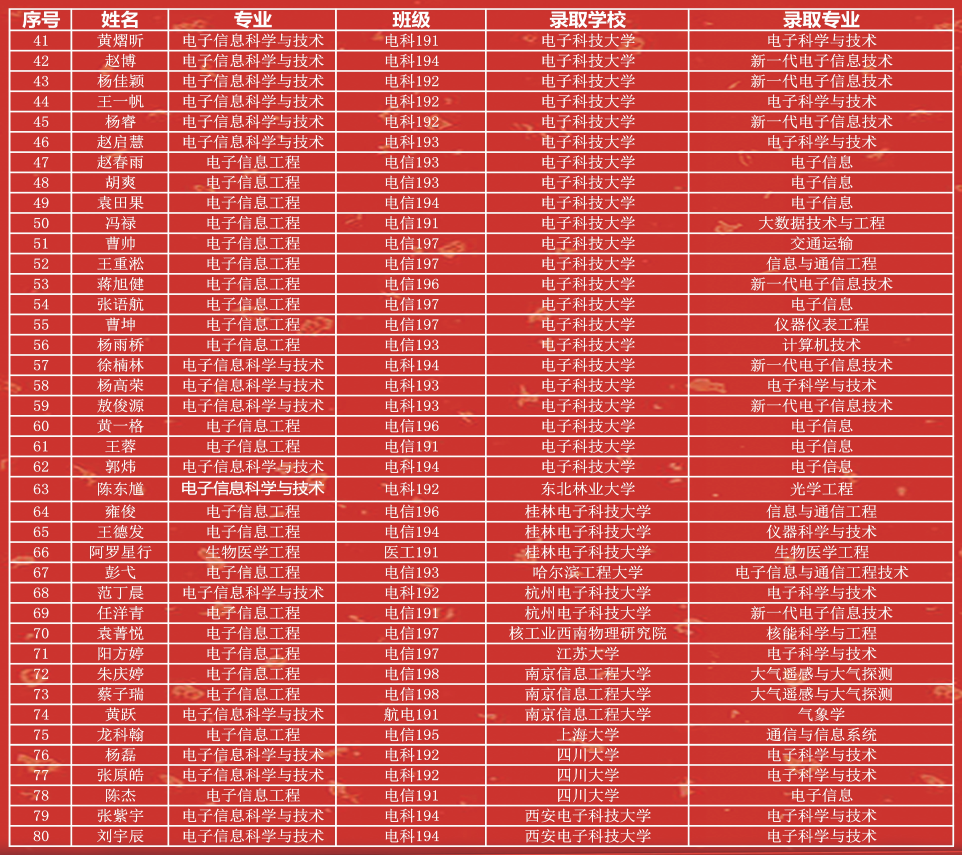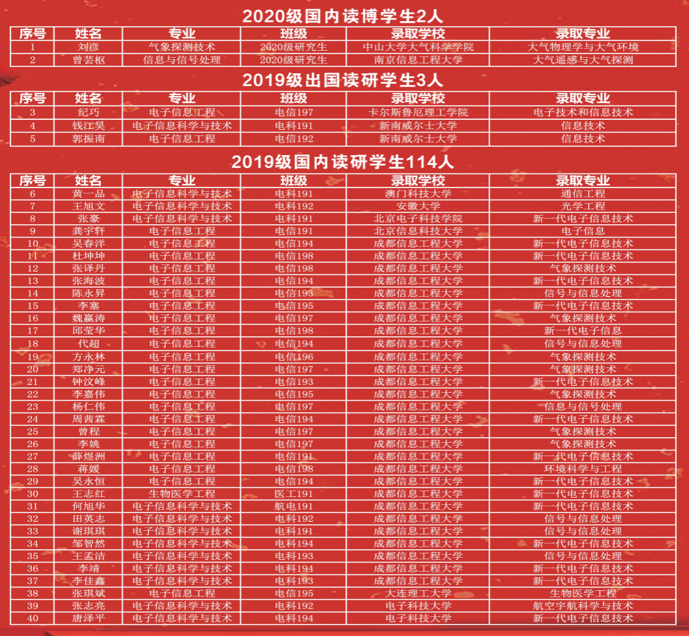 电子工程学院在2023年研究生入学考试中喜获佳绩,119名学生国内读博、读研或出国深造,祝贺以下同学取得优异的成绩,为学校学院争光,特发喜报。全院师生,以此共勉。