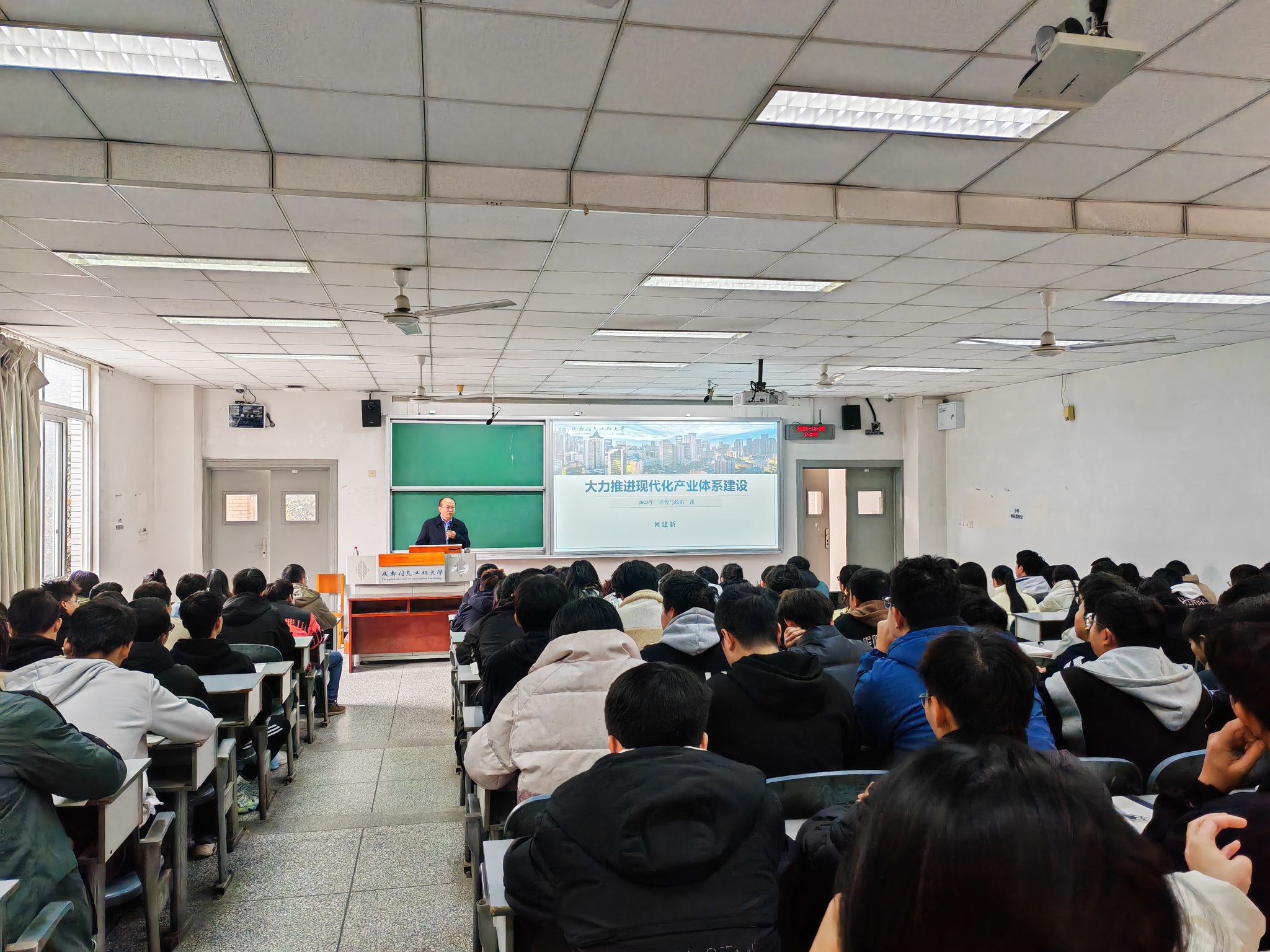12月8日下午,学校校长何建新在1209教室为电子工程学院2022级本科生上了一堂题为“大力推进现代化产业体系建设”的《形势与政策》课。