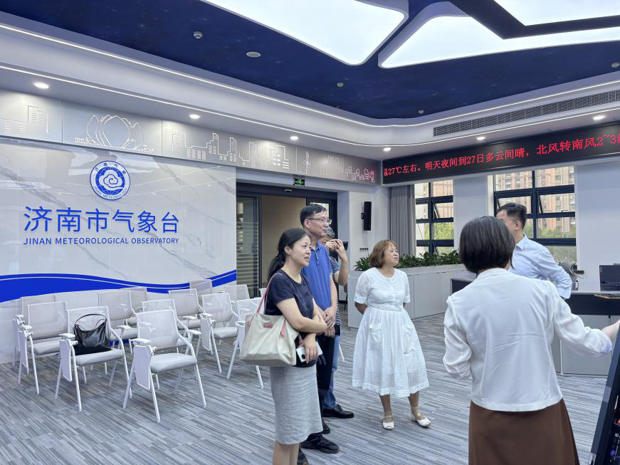 25日下午,在济南市气象台,气象局领导陪同老师们一起参观了即将投入使用的济南数字气象台。张永婧副台长为老师们介绍了数字气象台的应用板块,就强天气临近预报、精细化预报、气候监测、水文气象等模块进行展示。