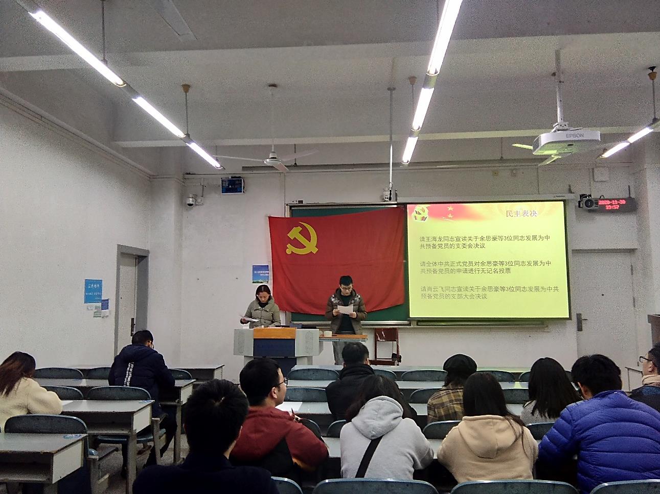 本次会议主要讨论了余思豪等3名同志发展为中共预备党员的事宜。首先,余思豪等3位同志对自己在积极分子考察期的思想、学习、生活、工作情况进行了总结,指出了自己的优缺点,表明了自己的入党动机和加入中国共产党的决心。其次,王海龙同志宣读了关于余思豪等3名同志发展为中共预备党员的支委会决议,在场全体正式党员对余思豪等同志发展为中共预备党员的申请进行了无记名投票表决。经党支部大会认真考察并结合3位同志的表现情况,以及党支部党员无记名投票表决结果,最终决定余思豪等3名同志发展为中共预备党员。最后,肖云飞同志宣读了关于余思豪等3名同志发展为中共预备党员支部大会决议。
