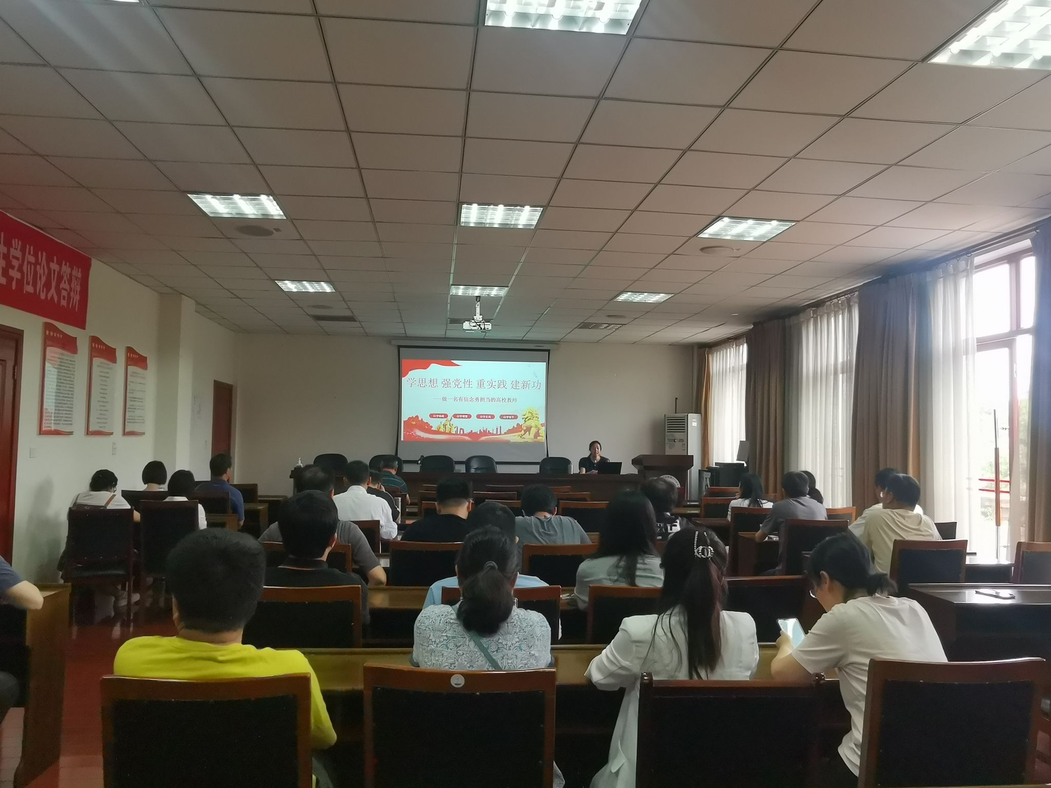 6月19日下午,电子工程学院党委书记缪燕平在气象楼215会议室为学院全体党员教师上了一堂题为“学思想 强党性 重实践 建新功——做一名有信念勇担当的高校教师”的主题教育专题党课,学院全体党员教师参加了此次党课学习。