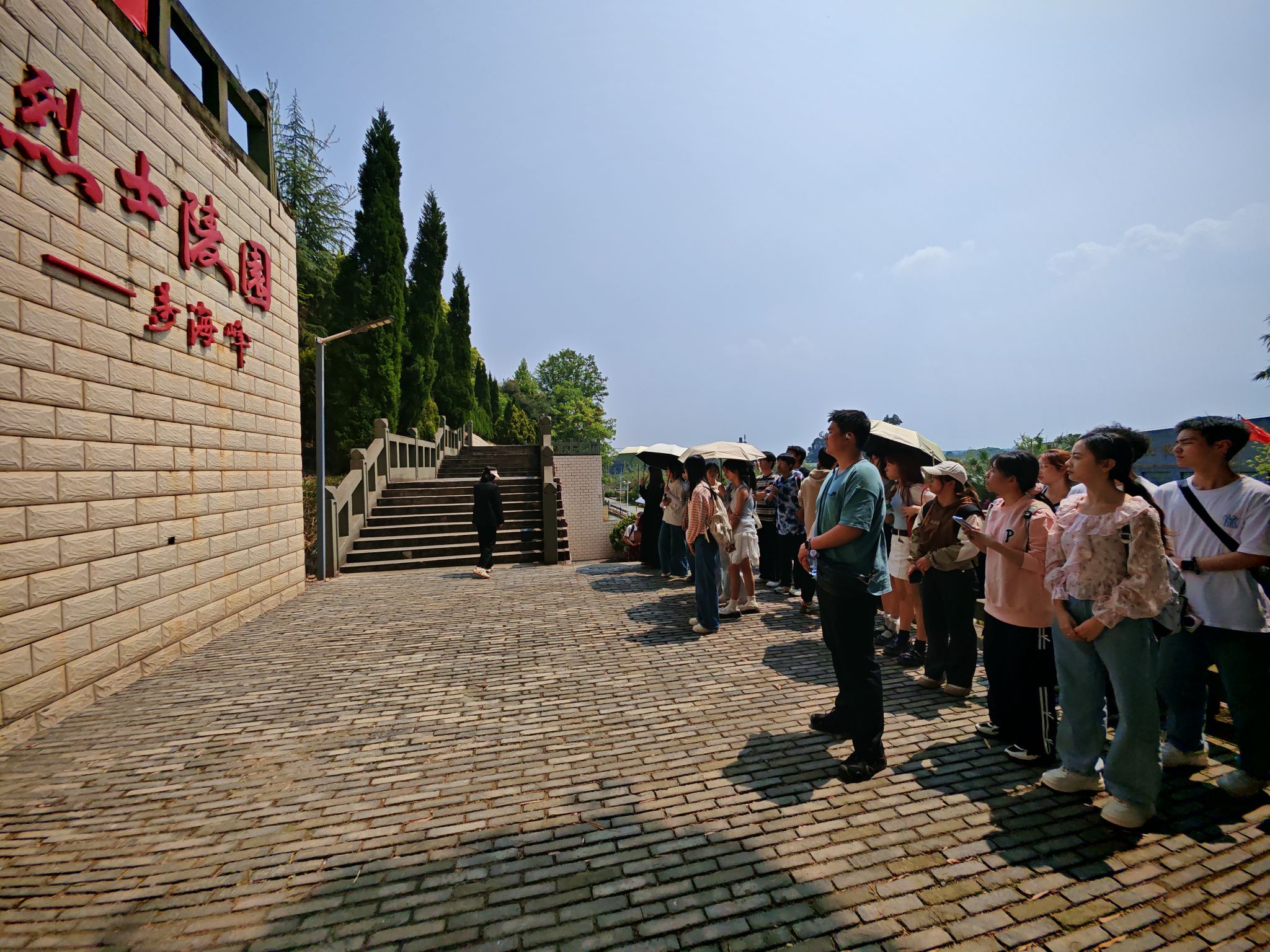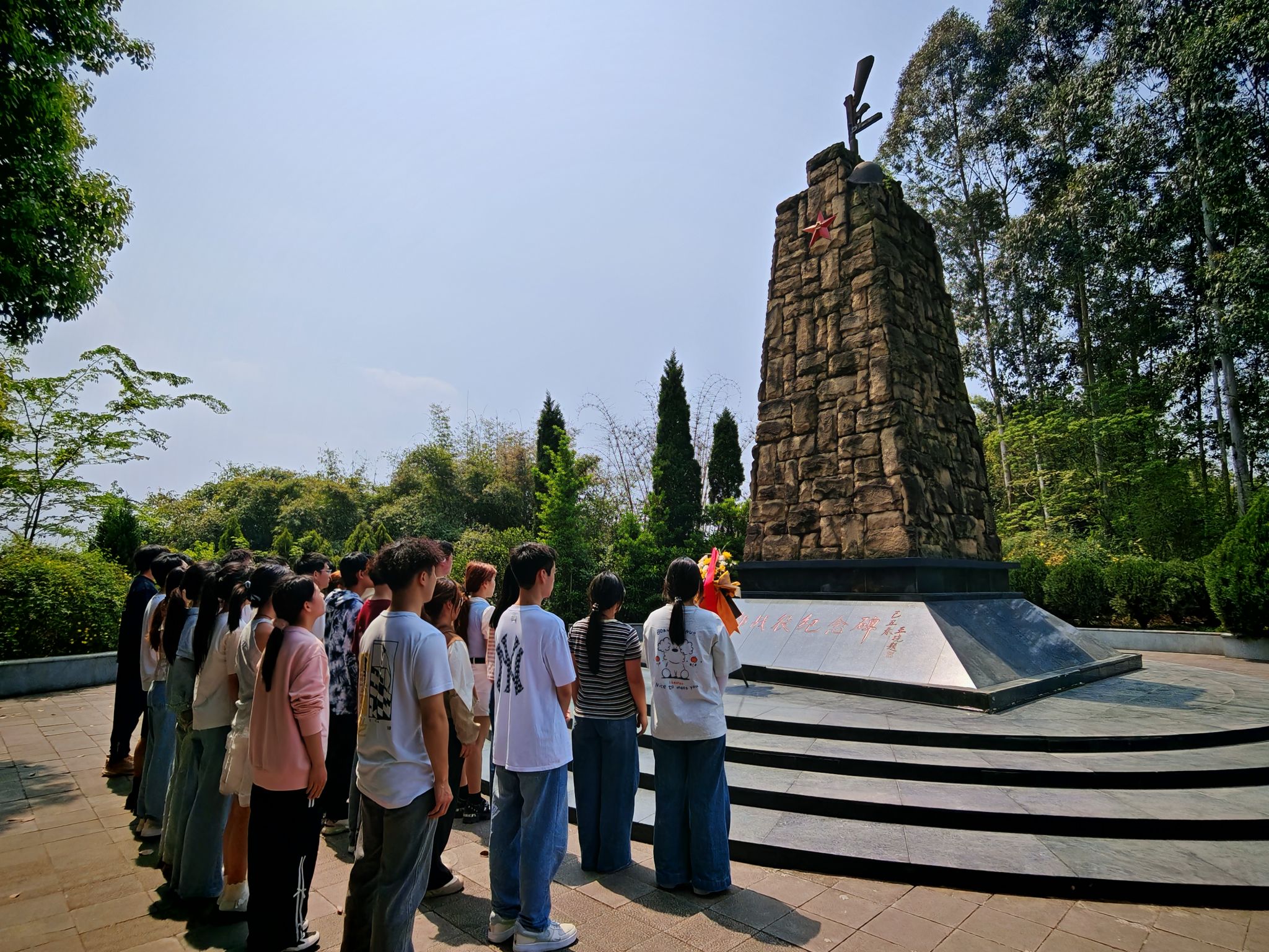在讲解员的引导下,师生党员一行怀着沉重的心情步入成都战役烈士陵园。在烈士陵园,同志们驻足凝思,追思先烈丰功伟绩,感受了革命先烈不畏牺牲、甘于奉献的革命精神。随后,同志们来到烈士纪念碑前,肃立默哀,向先烈们致以崇高敬意。默哀完毕后,同志们整理妆容,齐唱国歌,瞻仰烈士纪念碑,同志们备受鼓舞,深感振奋,深刻认识到革命胜利的来之不易,也更加坚定了传承和弘扬英烈精神的决心。