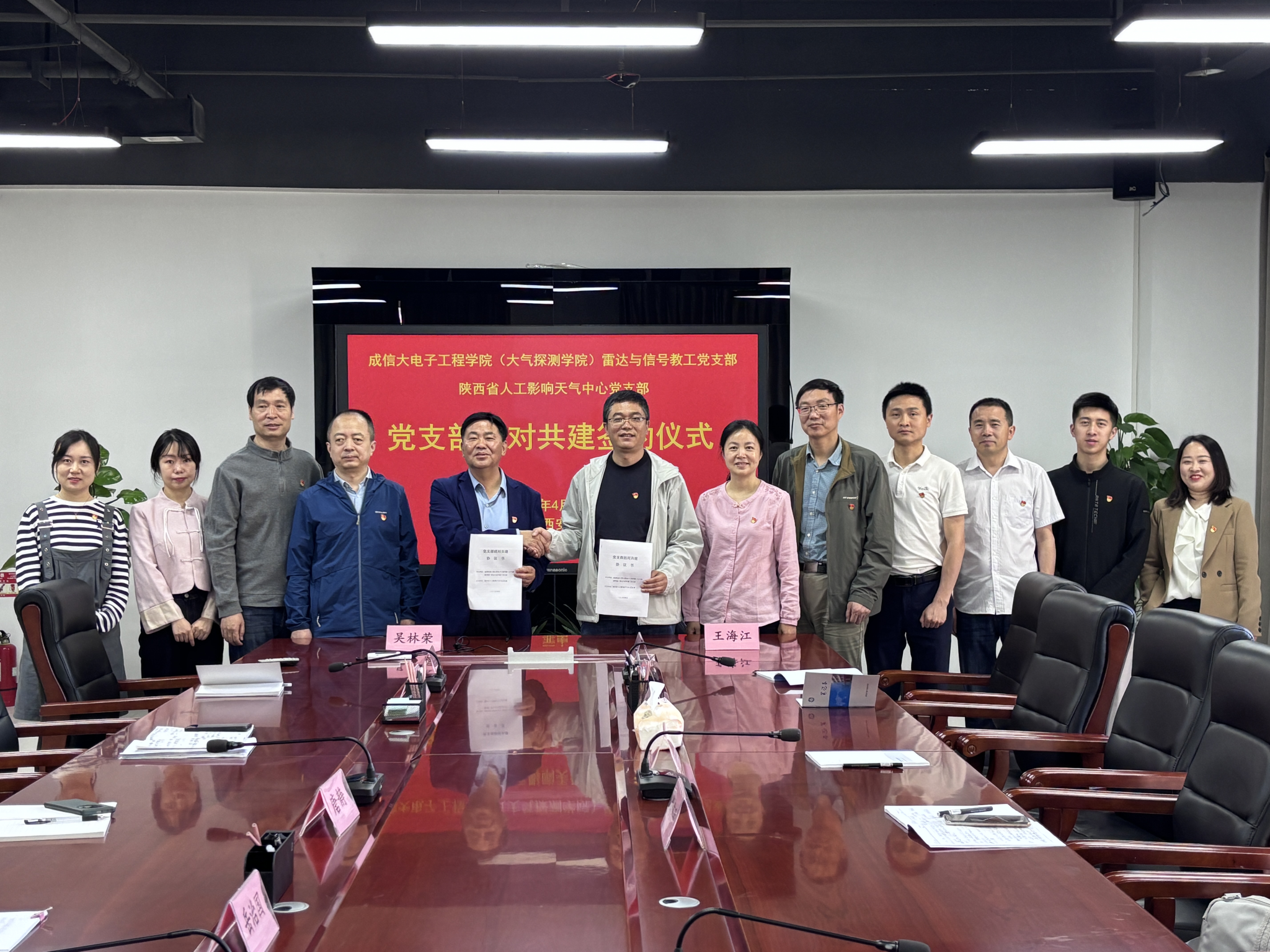 2025年4月14日,电子工程学院(大气探测学院)缪燕平、王海江等一行9人赴陕西省气象局进行走访交流,并开展支部共建活动。上午,陕西省人工影响天气中心党支部书记吴林荣与电子工程学院雷达与信号教工党支部书记王海江代表双方支部,签署了支部结对共建协议。此次签约标志着双方以党建为引领,在业务融合、资源共享、创新发展等领域开启深度合作新篇章。