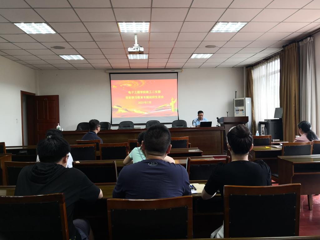 2021年7月9日下午,电子工程学院教工第二党支部在气象楼215会议室组织召开了党史学习教育专题组织生活会,会议由支部书记王海江主持,支部全体党员参加了会议。会前,王海江组织支部党员认真学习了习近平总书记在党史学习教育动员大会上的重要讲话、习近平总书记在庆祝中国共产党成立100周年大会上的重要讲话,开展了“学党史 崇师德”专题教育,对党中央指定的四本学习资料进行了学习研讨。支部委员会在会前通过普遍开展谈心谈话统一了思想、凝聚了共识、查摆了问题。会上,王海江代表党支部委员会汇报了2021年上半年党支部工作情况特别是开展党史学习教育情况,并通报了党支部委员会检视问题的情况。支部党员会前认真准备发言材料,会上认真汇报了自身在党史学习教育方面的心得体会及感悟收获,以及在坚定理想信念、加强党性锤炼、联系服务党员群众、为身边群众做实事办好事等方面的不足和差距。