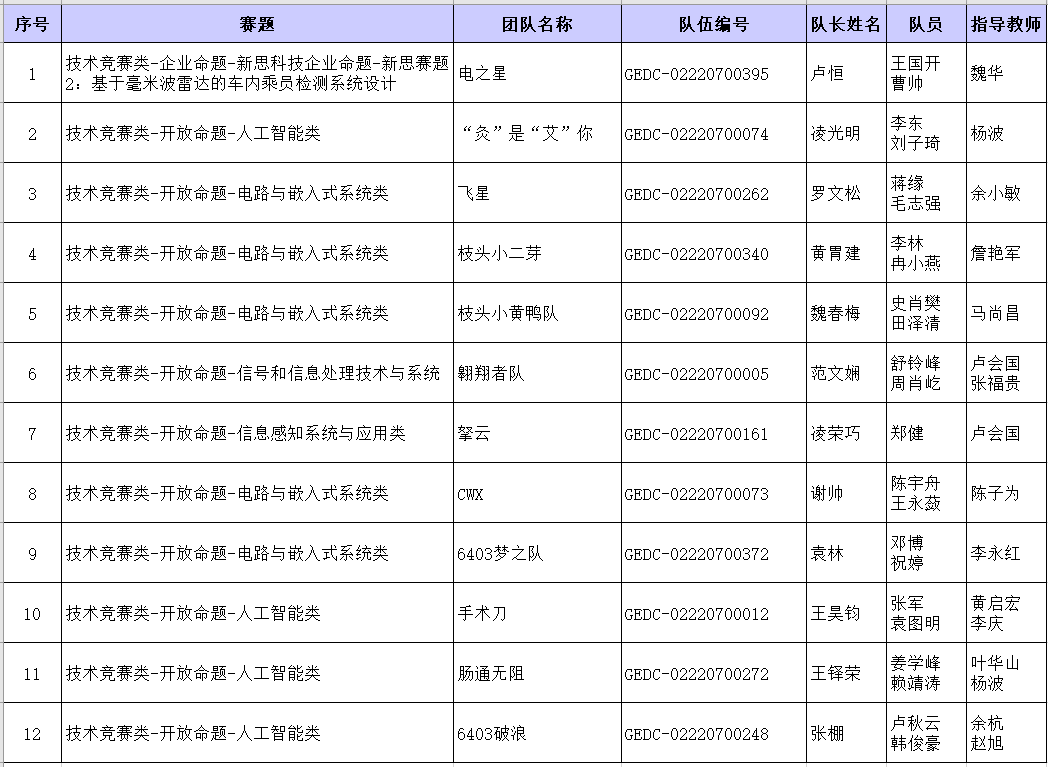 根据“兆易创新杯”第十七届中国研究生电子设计竞赛规则及校内报名情况,电子工程学院从选题依据(背景)、设计内容及目标、可行性、项目特色等方面对校内报名队伍的西南区赛参赛资格进行了审核,最终共推荐12支队伍参加西南区赛。参赛队伍信息如下: