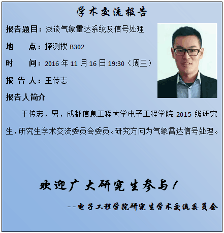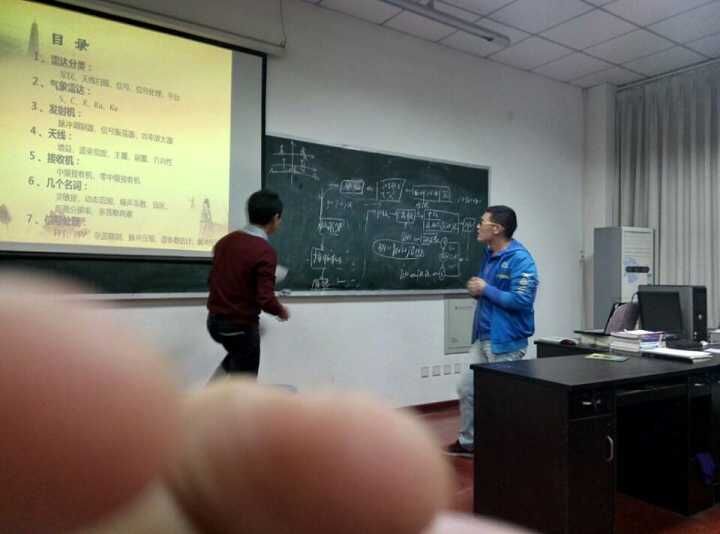 2016年11月16日,开展了电子工程学院研究生学术交流会的第二讲,主讲人王传志同学,题目“浅谈气象雷达系统及信号处理”。王传志同学详细介绍了气象雷达整个系统,雷达发射机、接收机、天线、显示器,边讲边逐步画出整个雷达系统组成部分,并讲解了雷达信号处理相关算法,推导了一些算法公式,熟练程度令人称奇。以下为王传志同学个人简介及边讲边画雷达系统图并与同学讨论的照片。