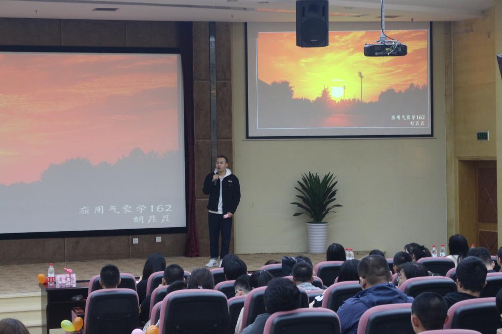 主持人致开场辞后,活动正式拉开帷幕,选手开始个人的作品展示。现场的评委和观众都被一幅幅生动形象的照片所吸引,欣赏了各位选手巧妙的构图和拍摄技术,感受到了图片中蕴含的人生哲理。选手讲述了自己拍摄照片的心境以及故事,选手邵丹的作品《观梦》更是获得了评委的一致好评。作品展示结束后,超老师对选手的作品一一进行了点评,给选手们提出了建议,选手和观众都受益匪浅。比赛中播放两个视频,让在场的同学们学习到了不少气象知识“云存在的最高海拔是多少千米?”“太阳光是如何促使水分蒸发的?”在气象光影变幻中感受到了气象的美好,了解到了气象知识的重要性,引起了同学们对云图、 气象的兴趣