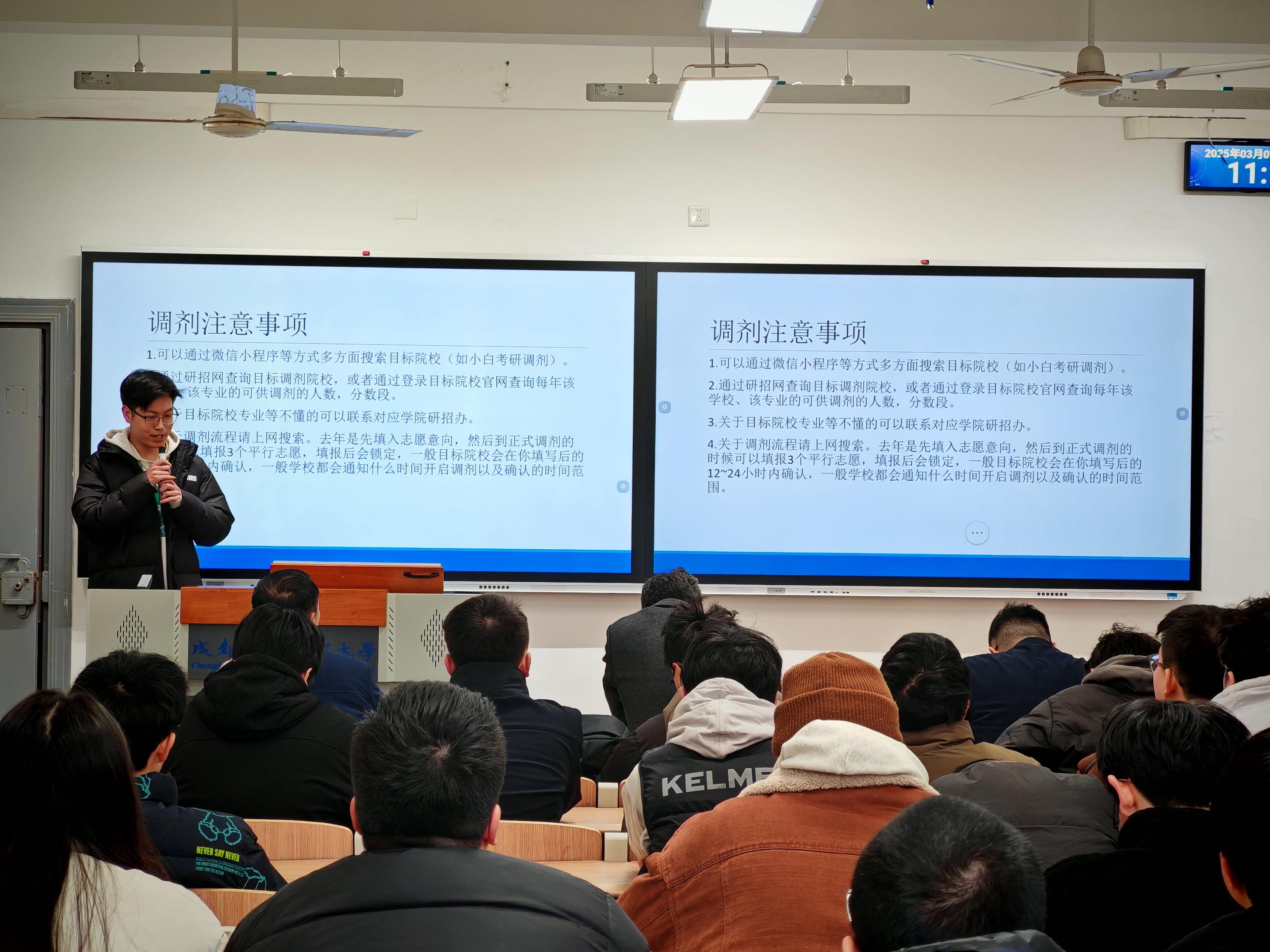 24届考研学生代表马泽林、何文博、张国庆、陈瑞杰、蓝梓豪,分别结合自身考研复试经历,从录取数据分析、复试课程准备、着装要求、竞赛项目介绍、自我简介、研究方向探讨、口语交流及问答、简历制作、导师联系等方面,与同学们交流了自身经验和技巧。针对调剂这一关键环节,学长们分享了院校选择的策略和信息来源。建议同学们在选择调剂院校时,要综合考虑学校的地理位置、专业实力、招生政策等因素,合理定位。同时,还介绍了多种渠道获取调剂信息,鼓励同学们积极主动与招生院校联系,争取更多机会。