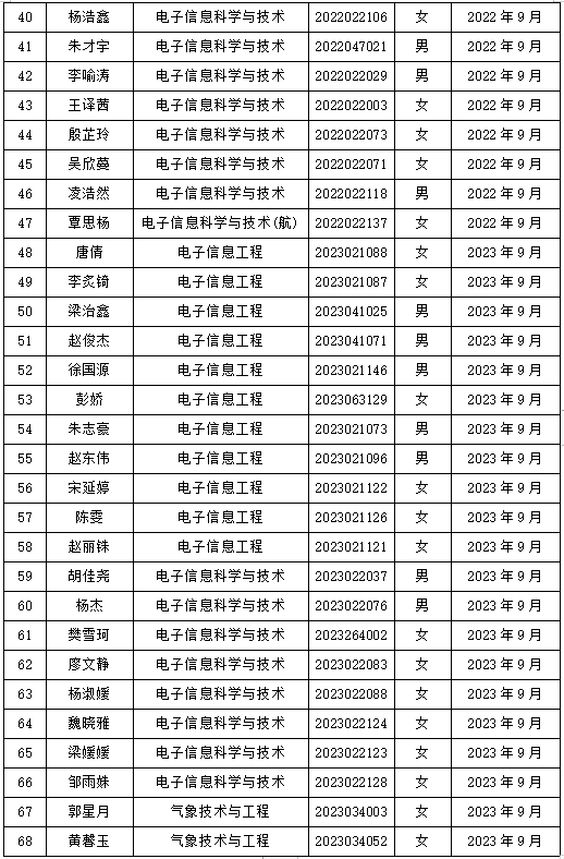 根据《william威廉中文关于评定2024 年国家励志奖学金、国家助学金的通知》(成信学字〔2024〕 7 号)文件要求, 2023-2024学年国家励志奖学金评定经学生个人申请,资格审查,专业年级评议小组评议,辅导员审核,学院集体审议,共推荐68名候选人参评学院国家励志奖学金,现将名单予以公示。如有问题,请于2024年10月14日-2024年10月16日反馈,联系人:曹老师,气象楼222,电话:85966498
