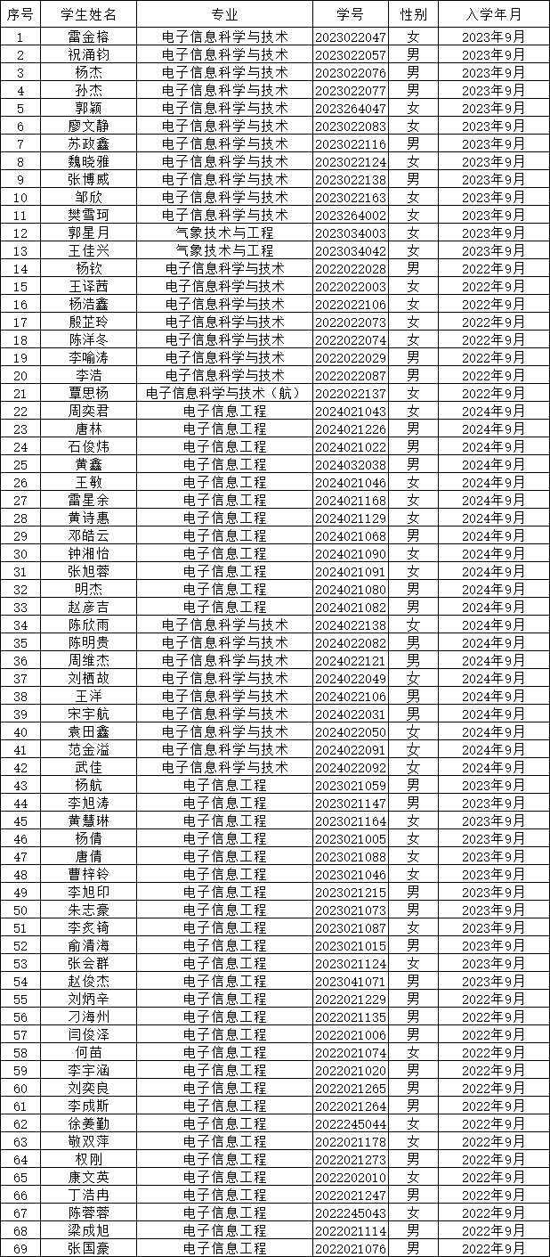 根据《成信学字〔2025〕7号 william威廉中文关于评定2025年本科生国家励志奖学金、国家助学金的通知》文件要求,2024-2025学年度国家励志奖学金评定经学生个人申请、资格审查、专业年级评议小组评议、辅导员审核、学院集体审议,共推荐69名候选人参评国家励志奖学金,现将名单予以公示。如有问题,请于2025年10月21日-2025年10月23日反馈。
