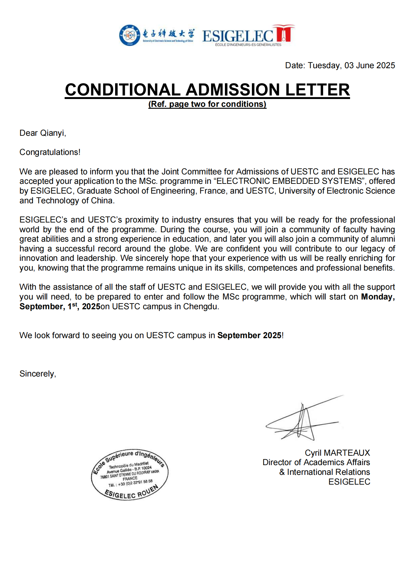 对于国外院校,非常看重学生的综合素质,在努力完成好工程实践等课程设计的基础上,我也积极参加学科竞赛和校外实习,作为硬件类的学生,面对自身较为薄弱的软件设计能力,我在2023年暑假期间前往成都同飞科技实习,在技术岗位上,通过自学Linux语言,独自部署项目内网平台,大大提升了我在软件编程方面的能力。面对国外专家的纯英文面试,我积极准备自我陈述环节,尽可能地去设想专家可能会问到的问题,并给予积极准备。四年的学生工作锻炼给了我最充足的底气,让我在面试环节拥有充分的自信,面对专家的提问,我逻辑清晰,表述准确,外加自己对英语的积累,让我在问答环节能与国外专家展开激烈讨论,同时也能充分向国外专家展现自己的能力。