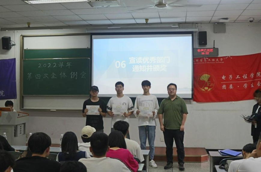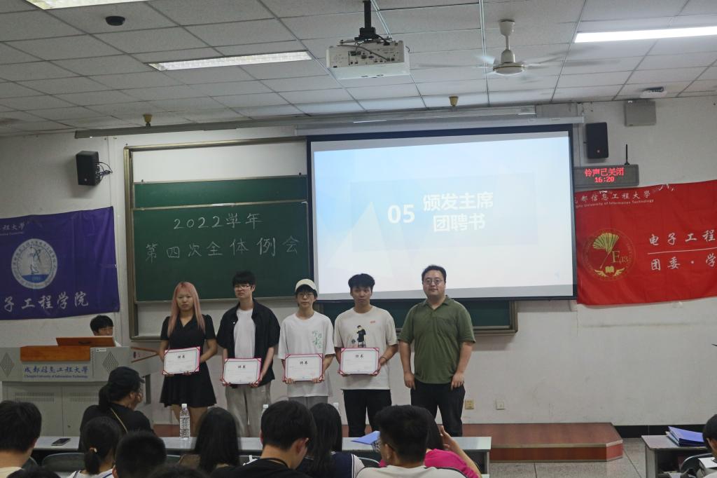 在电子工程学院团委•学生会全体成员这一学年的不断努力下,团委•学生会的各项工作均取得圆满成功,重新拿下了“红旗团委”的荣誉称号。大会先由团委副书记周思远学长对这个学年的工作做了总结,他充分肯定了大家在这一年里的工作结果,表扬了全体成员。由欧阳功铭学长为在这一年的里辛勤工作的全体成员颁发了聘书。接着,周意超老师为主席团颁发了聘任通知书。