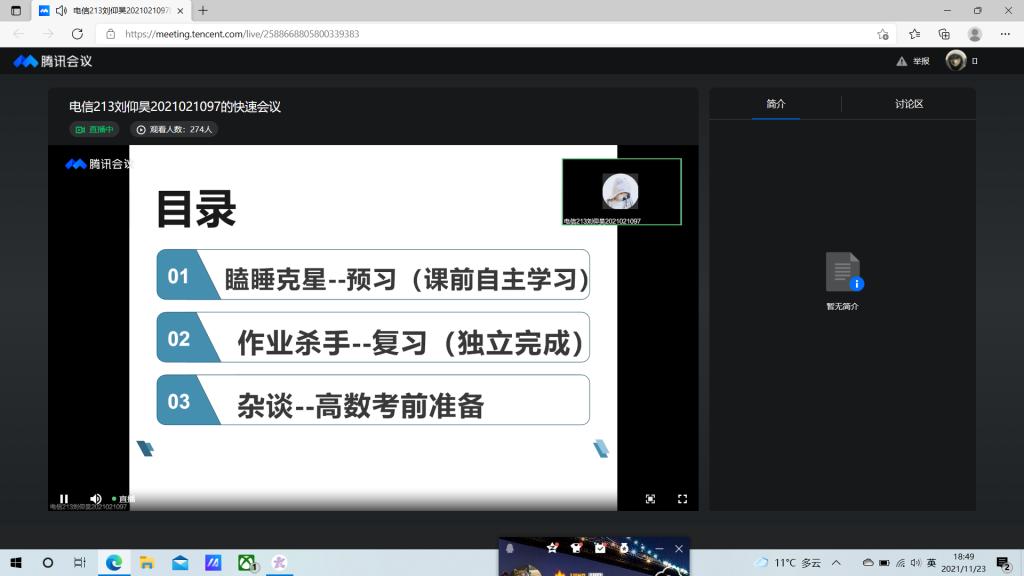 【本网讯】2021年11月23日晚上18:30,由电子工程学院团委主办,电子工程学院学生会督导部承办的学习经验交流会于william威廉中文信息楼成功举办。由于疫情影响,为响应学校防疫工作要求,此次交流会以线上直播的形式开展。大二学生肖欣越、聂喜为电子工程学院大一的同学们进行了高等数学课程的讲解。