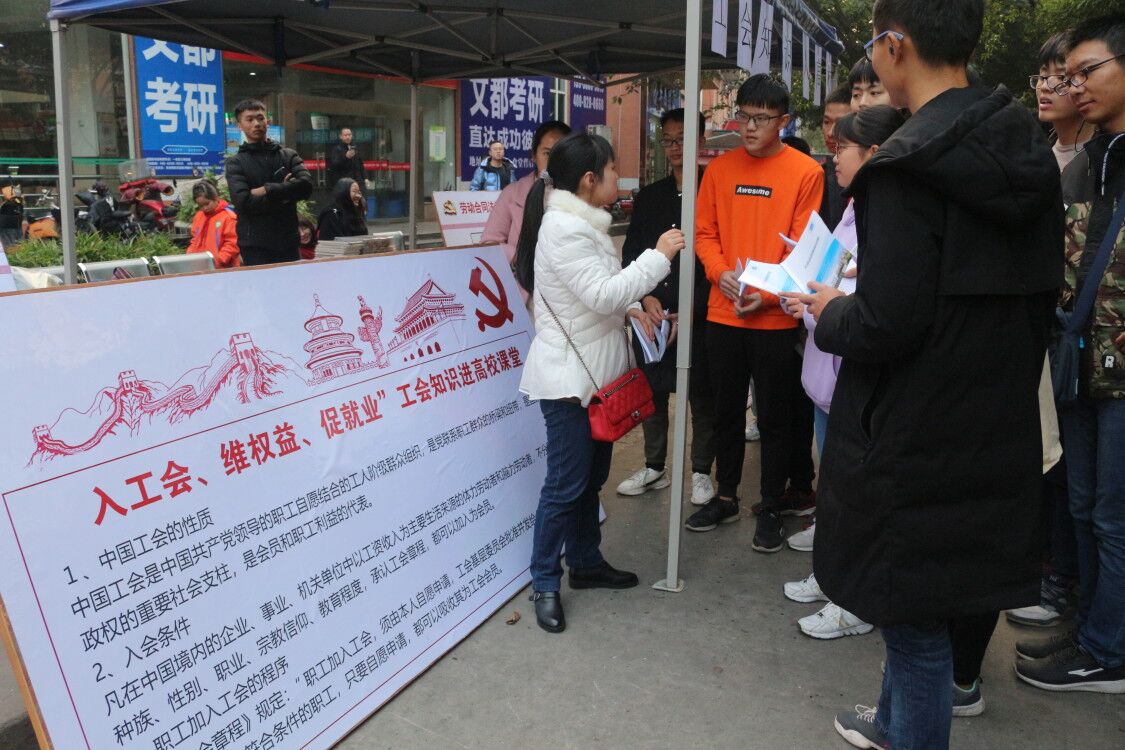 在活动现场,曾利老师详细地讲解了工会的相关知识,并与同学们互动答疑,给同学们发放工会会员维权手册。现场的同学们认真阅读了展板上的工会知识,了解了工会的性质和职能、工会会员的基本权利和义务、劳动合同法的相关知识等等。通过阅读维权手册,更多的同学认识到“入工会、维权益、促就业”的重要性。在此次宣传活动中,同学们阐述了自己在就业、创业方面的工作情况,提出了当下所面临的问题和困难,曾利老师一一做出了解答。同学们积极提问,老师细心解答,活动一共发放了工会会员维权手册200余册。