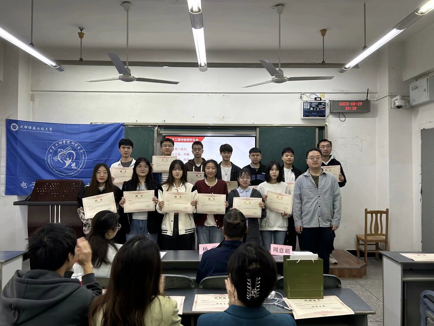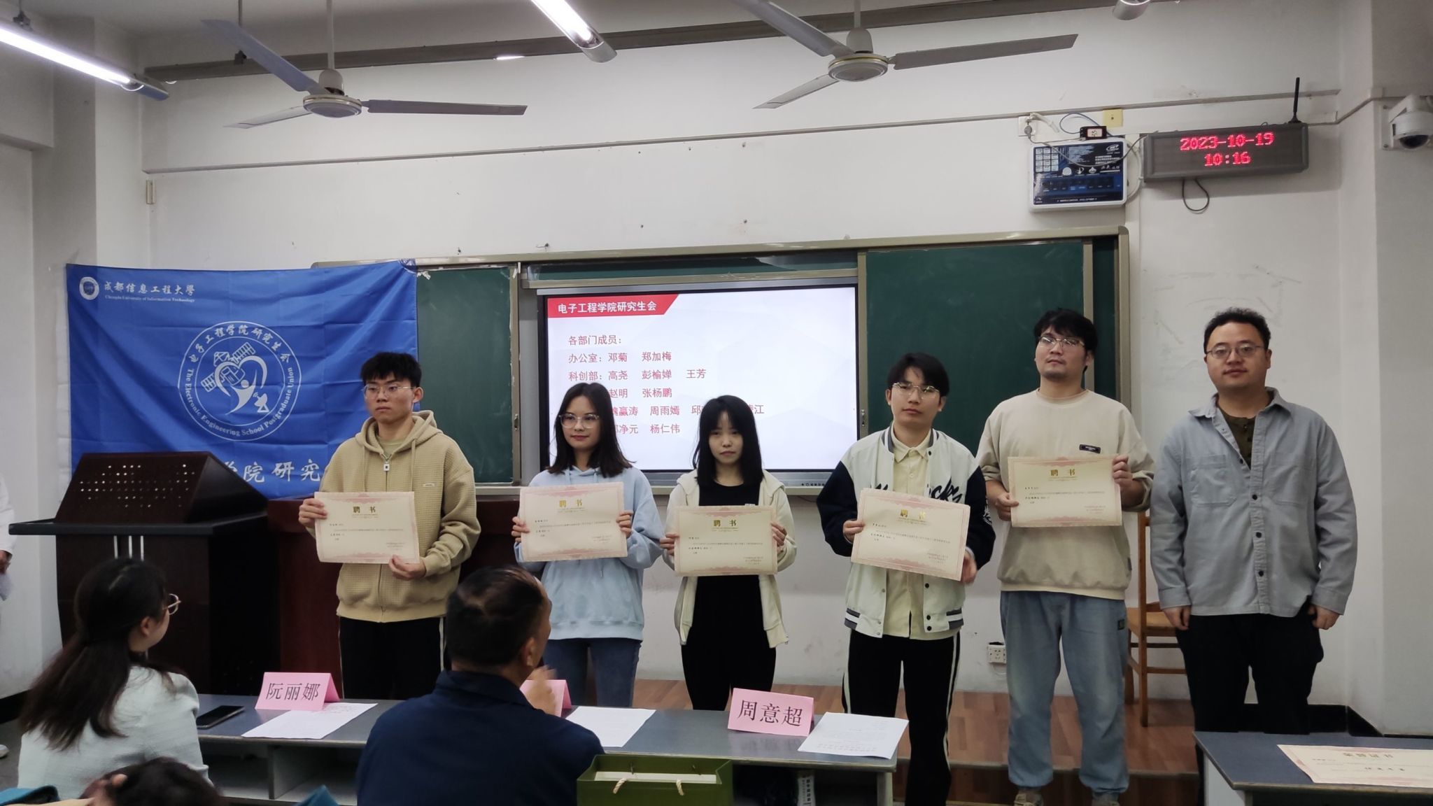 团委书记周意超宣读研究生会成员名单,并为本届电子工程学院研究生会成员颁发聘书。同时新一届的研究生会要重视建设学术文化氛围,努力维护同学们的权益,加强各部门内组织建设,丰富校园文化内涵。