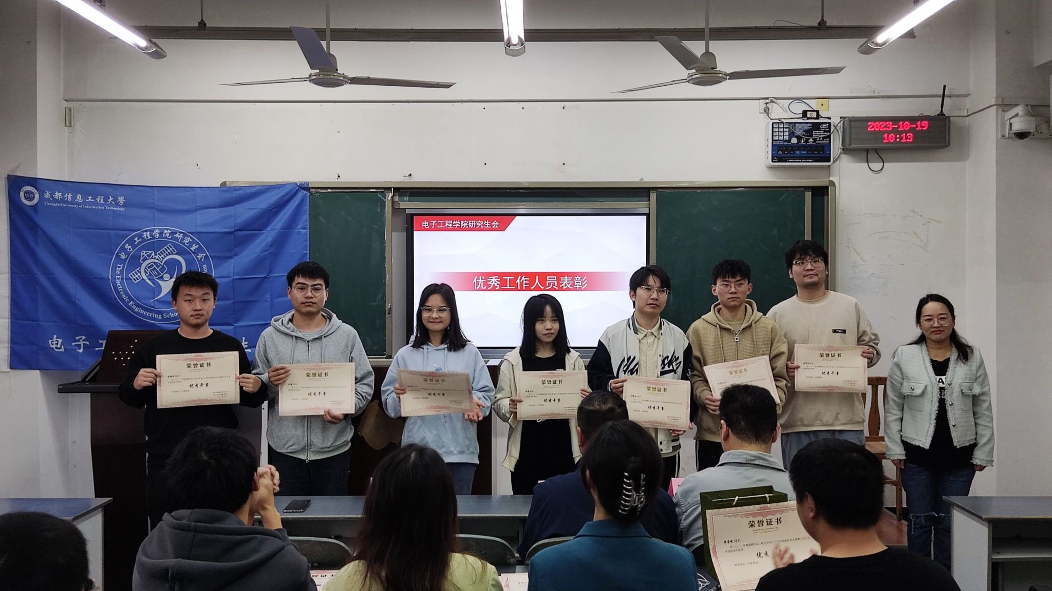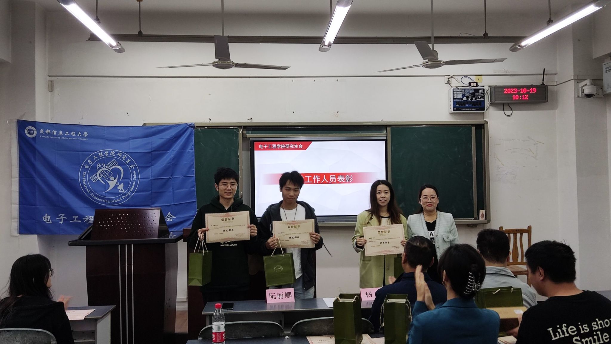 学生科科长阮丽娜宣读相关文件,并为上一届电子工程学院研究生会成员颁发证书和礼物。