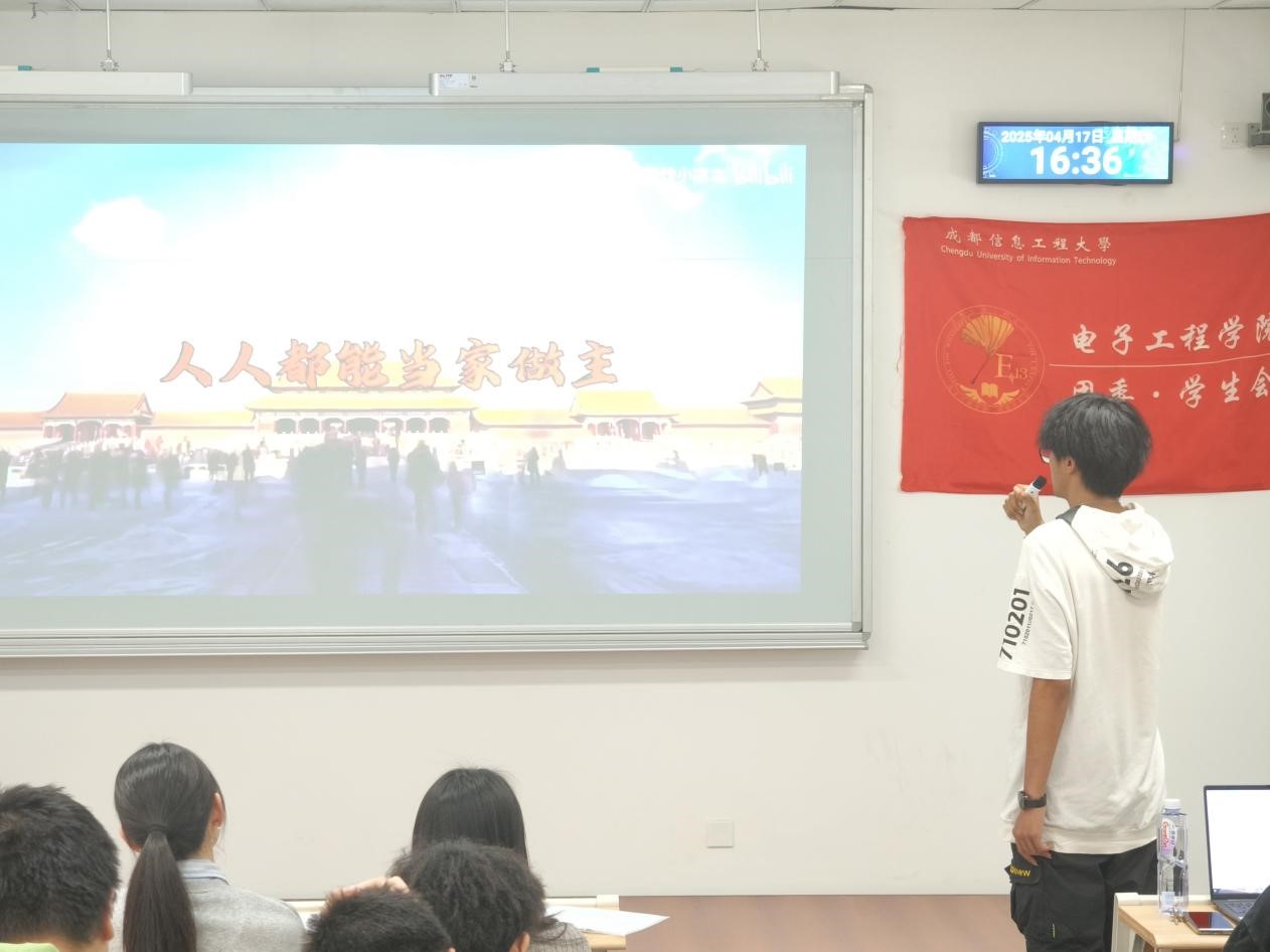 在五四青年节来临之际,为锻炼学生的语言能力,提升综合素质,同时让青年学子在经典影视中汲取奋进力量,传承五四精神,4月17日电子工程学院(大气探测学院)于H1201教室举办了“经典之声,‘语’你相伴”配音大赛。电子工程学院辅导员老师和数百名学生参与本次活动。