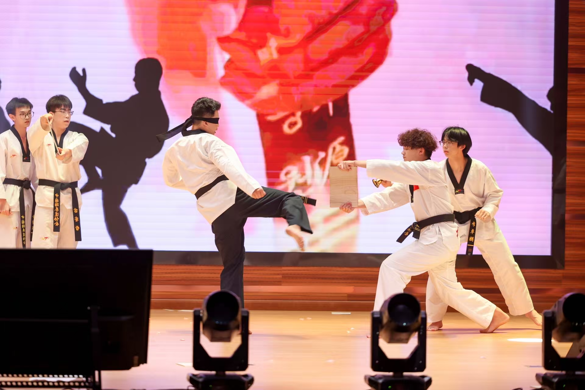第二篇章 “青春有志・绽芳华” 同样精彩纷呈。团委气象科普(科技)部带来的话剧《风云十二时辰》,巧妙地将专业知识融入跌宕起伏的剧情。省级优秀毕业生表彰后,优秀毕业生代表牟俊杰发言,他回顾大学四年的学习生活,分享在学习中不断突破自我的经历,为学弟学妹们树立了榜样。陈文雯老师演唱的《你曾是少年》,温柔的嗓音诉说着青春的美好与珍贵;2025届毕业生胡晏铭等带来的跆拳道表演,腾空侧踢、回旋踢等高难度动作一气呵成,尽显青春的热血与豪情。
