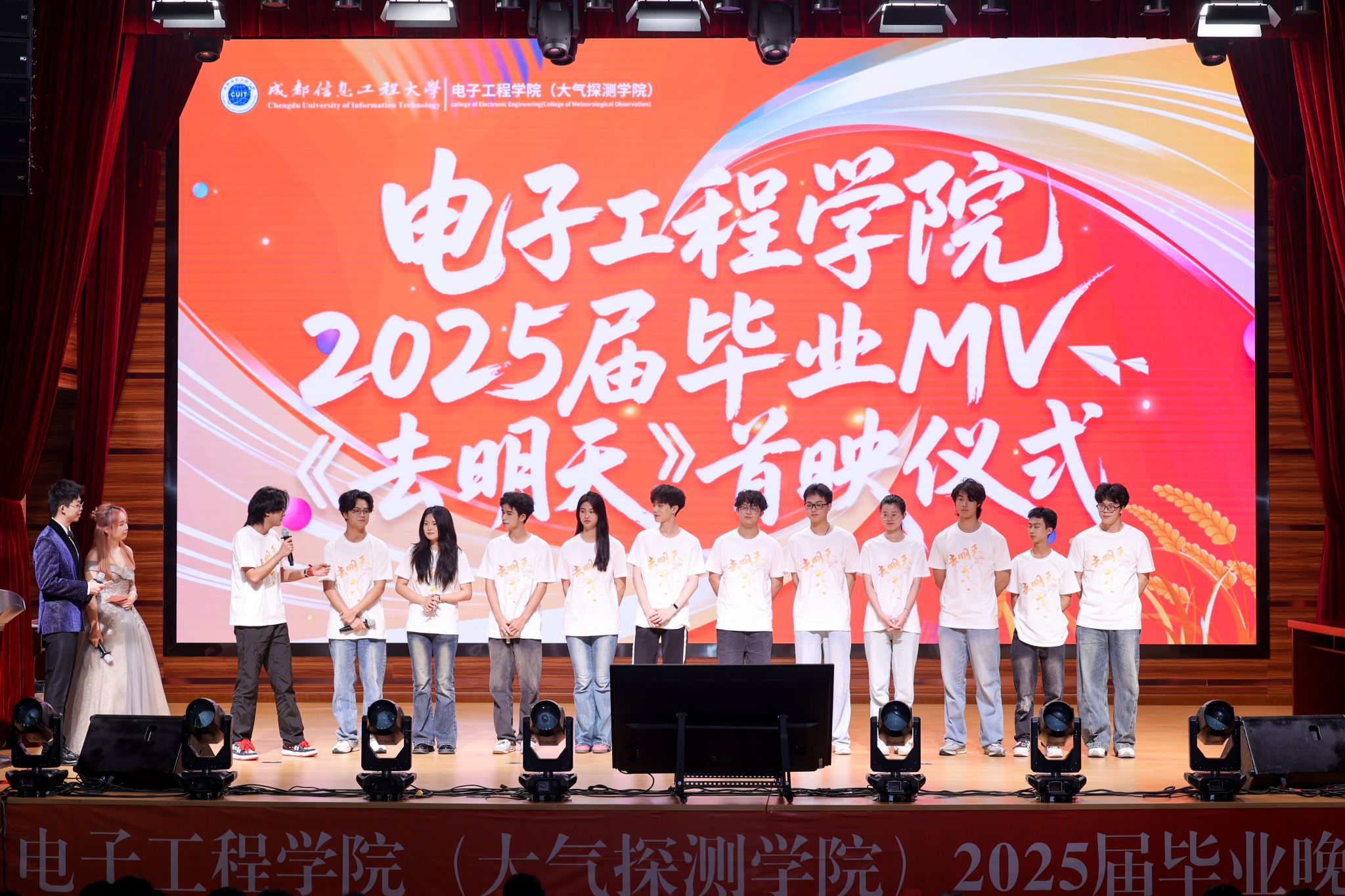 本次毕业晚会分为 “电子情深・初相遇”、“青春有志・绽芳华”、“携手同行・向未来” 三个篇章。晚会在2025届毕业MV《去明天》首映仪式中拉开帷幕,该 MV 由学院同学自编自导自演,记录了同学们从初入校园到成长蜕变的点点滴滴。播放结束后,主创团队们接受采访分享了拍摄趣事与难题。指导老师刘计表示,拍摄毕业MV旨在为毕业生留存美好回忆,为学院同学提供展示、锻炼的平台。