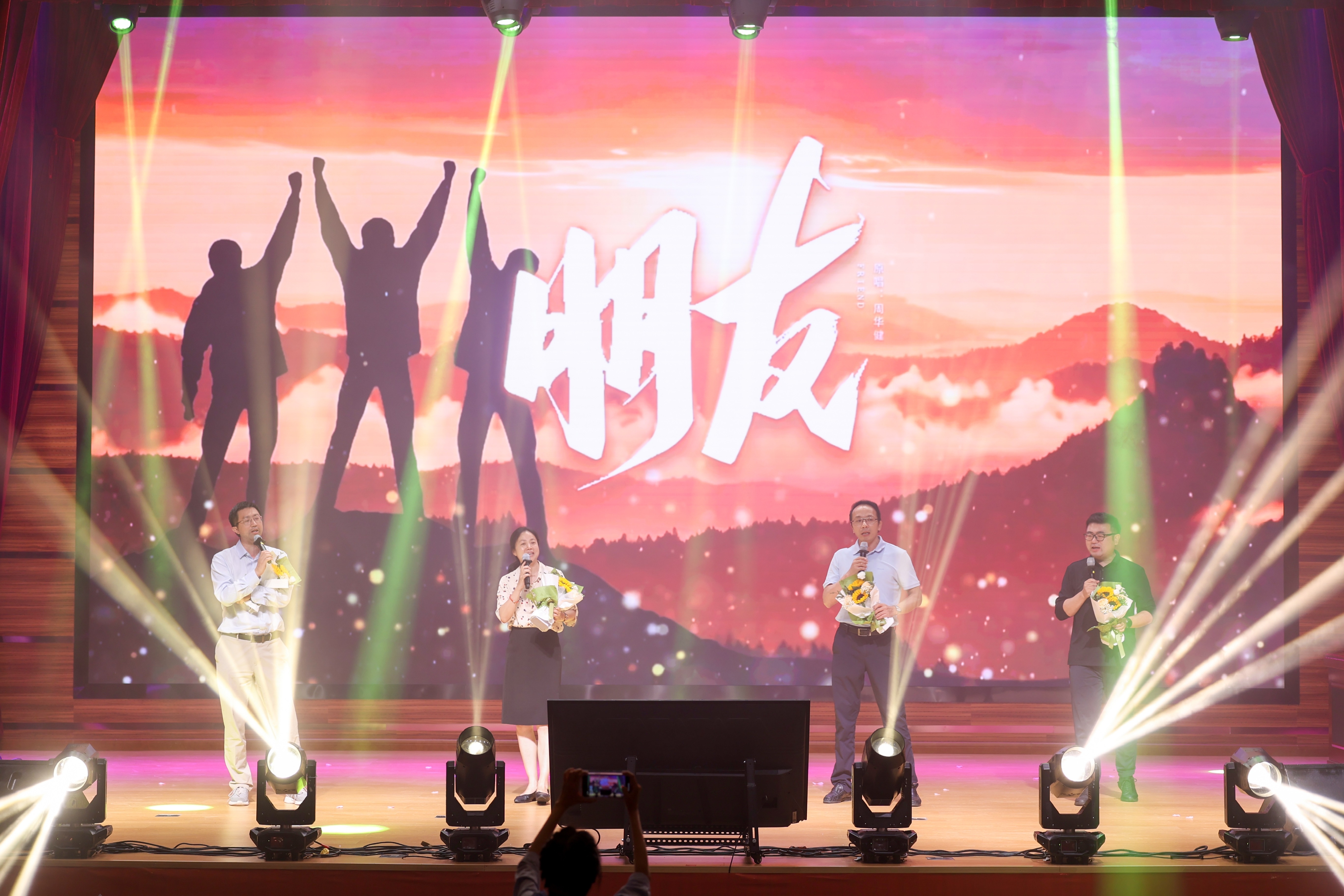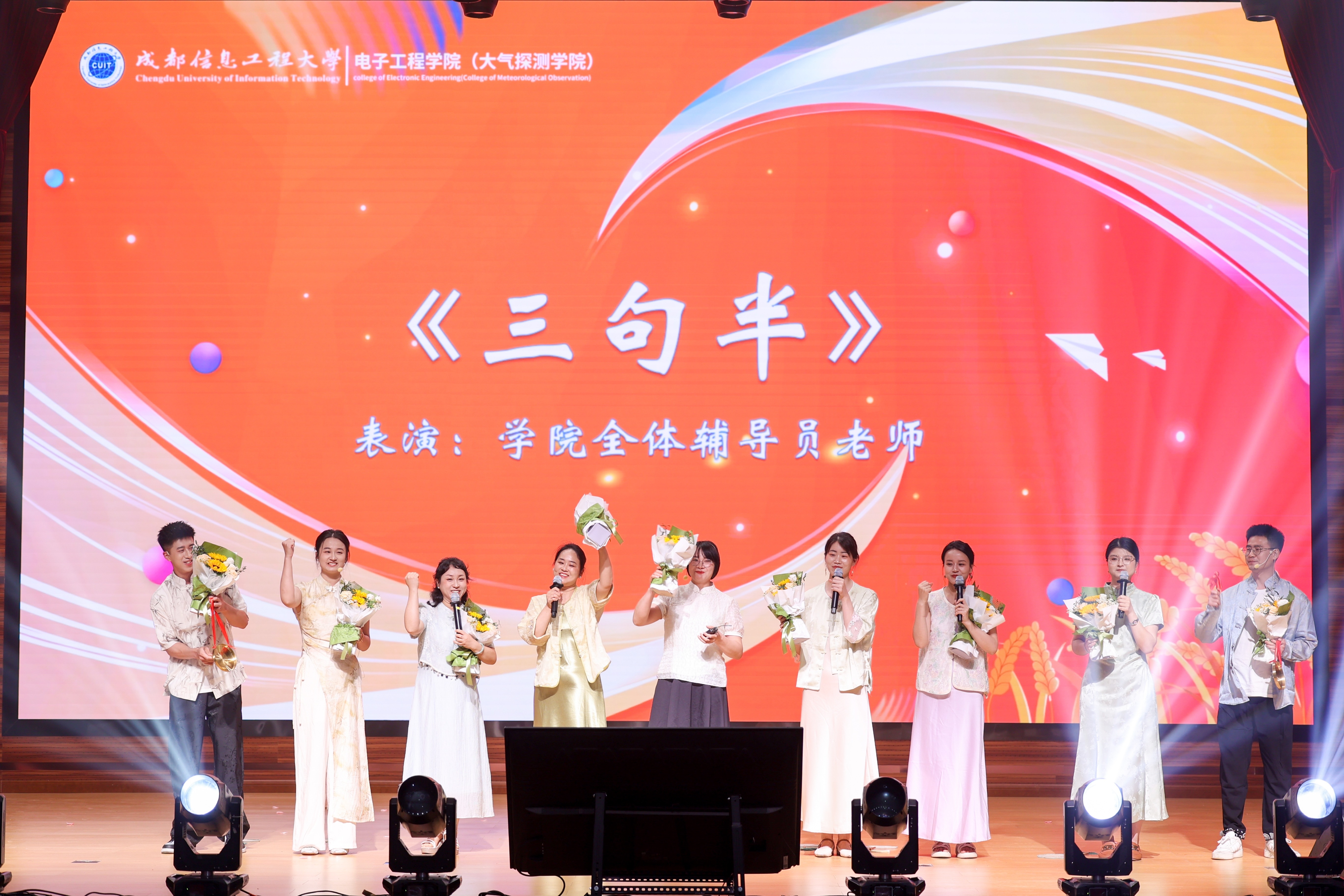 第一篇章“电子情深・初相遇”中 ,团委、学生会全体部长带来活力四射的舞蹈《可爱摆》;紧接着,院长张福贵登台对即将离校的毕业生寄语,表达对毕业生的美好祝福与期望,勉励大家在新征程中继续发光发热;随后国家奖学金表彰环节,国奖获奖代表张媚兰分享自己的学习心得和成长故事,激励着在场的每一位学子;学院领导合唱的《朋友》,唱出了师生间深厚的情谊;辅导员老师们带来的《三句半》,以幽默诙谐的语言,串联校园生活的点点滴滴。