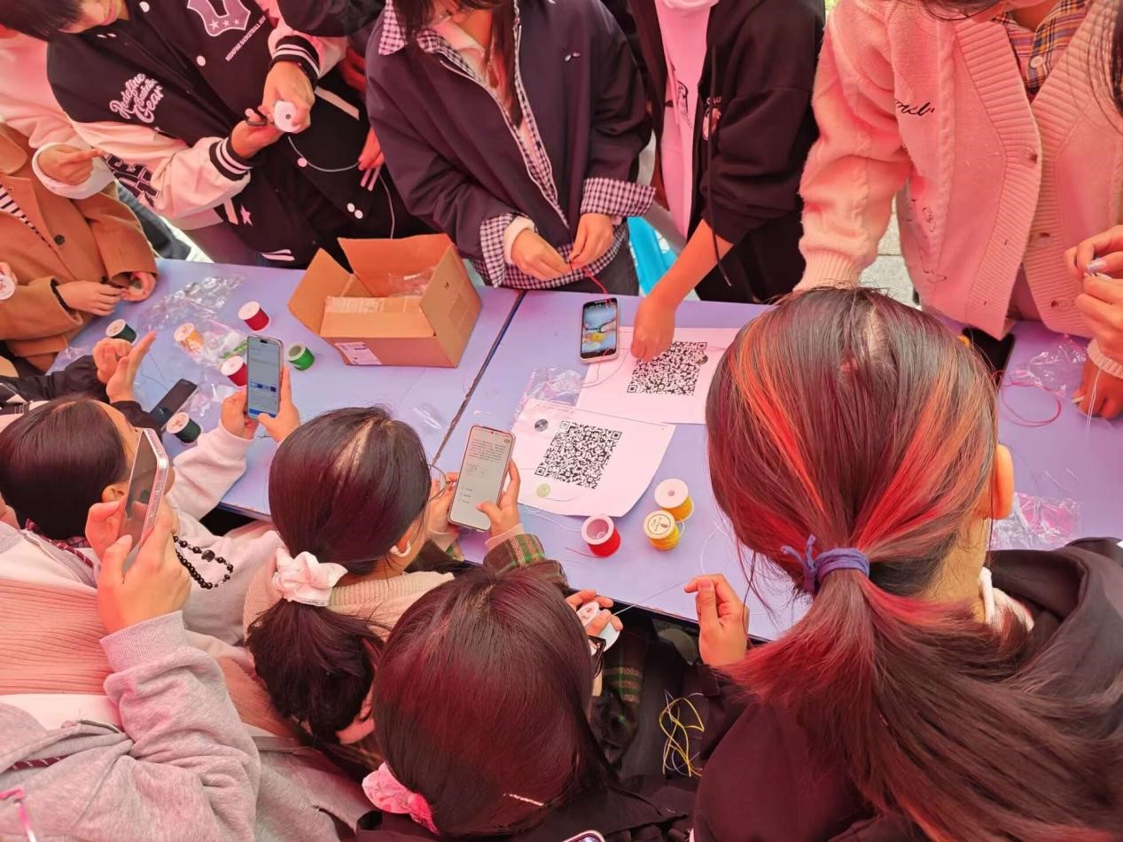 活动伊始,现场已人头攒动,同学们有序聚集,满是期待。启动后,摆有材料、工具的桌前热闹非凡:有人对照教程研究步骤,有人交流创意,工作人员穿梭指导,氛围活力又温馨。参与队伍沿大道排开,同学们交流平安扣文化寓意,满含对非遗的热爱与对平安的期待。