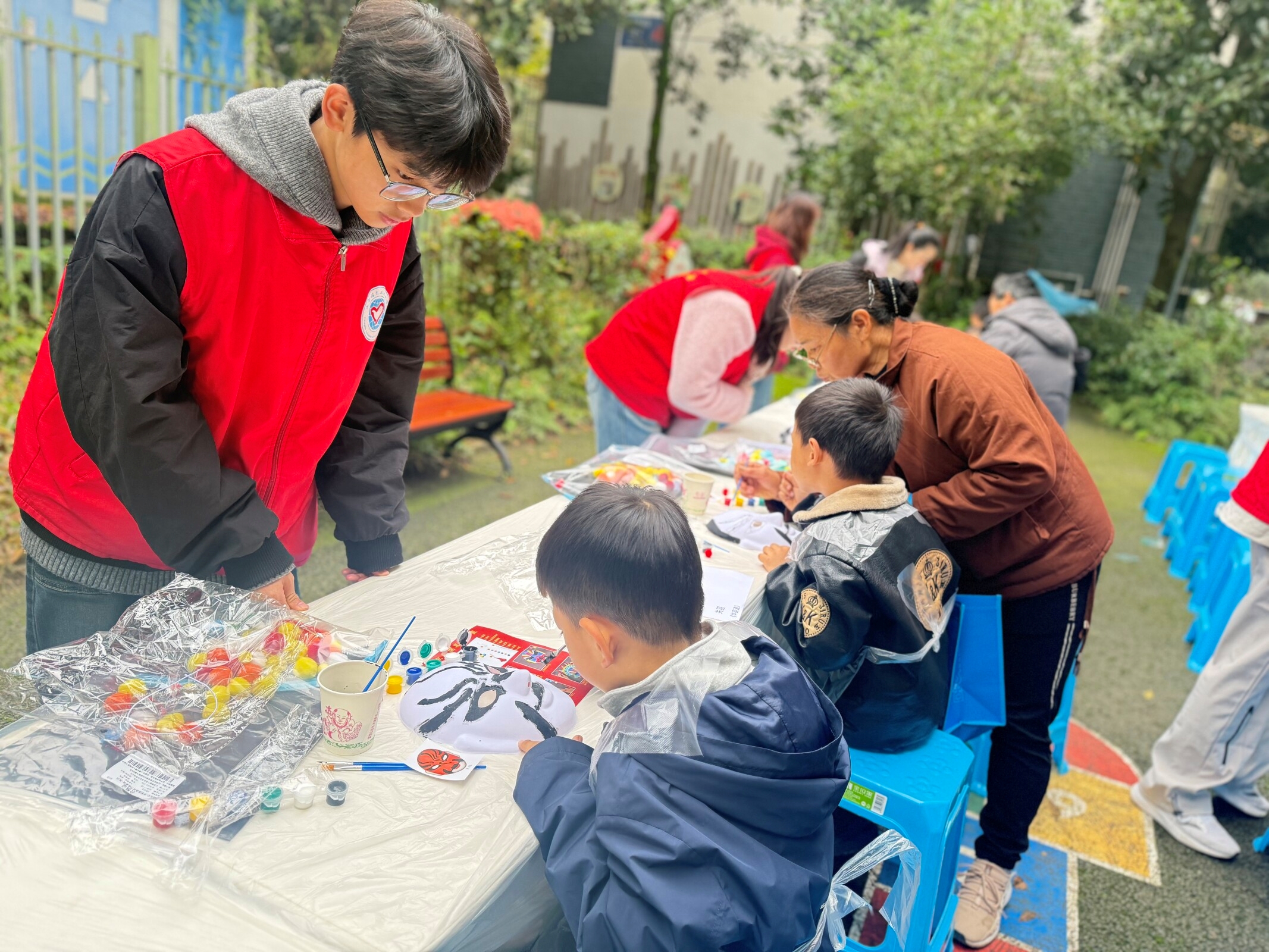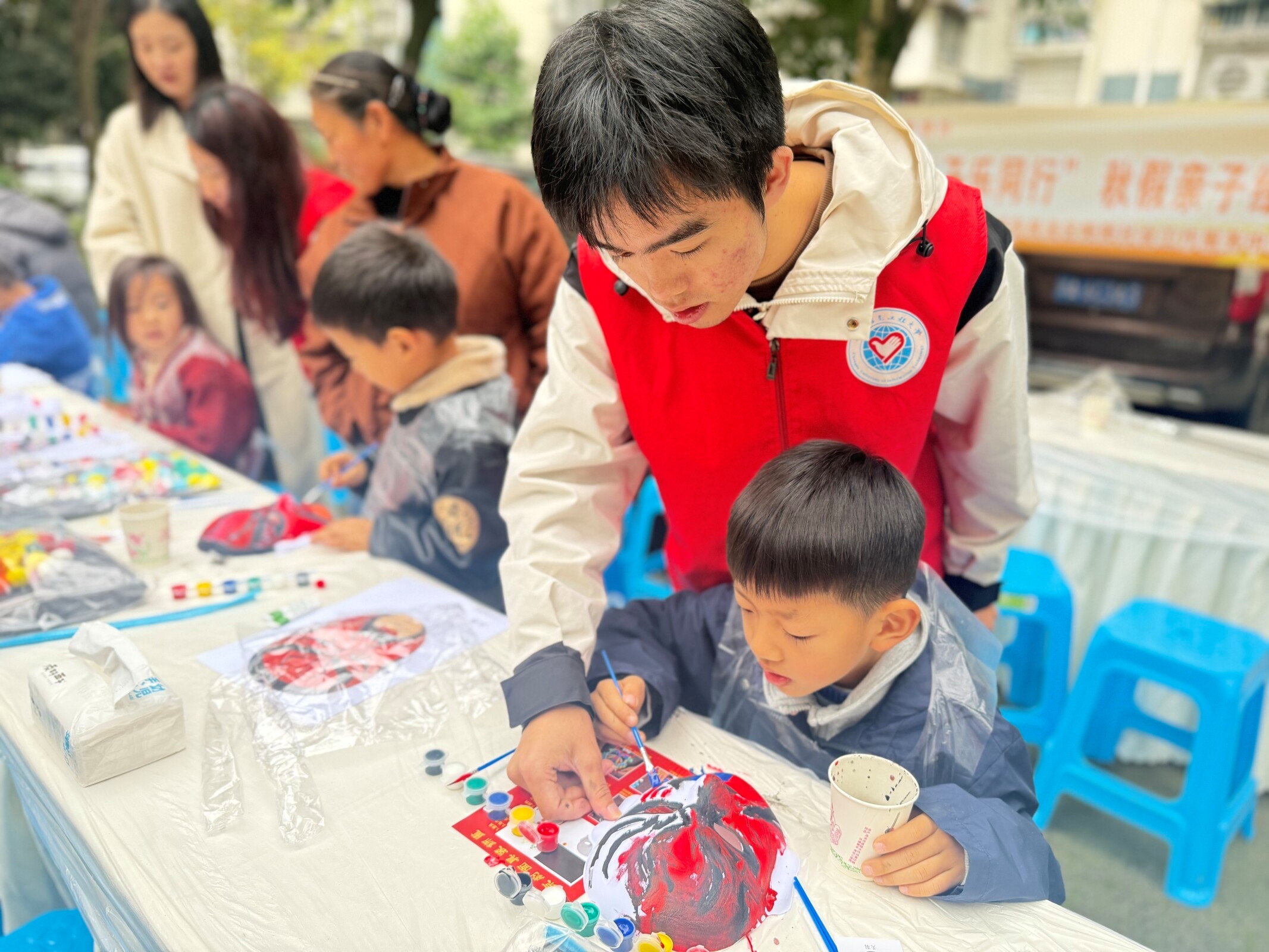 活动筹备阶段,志愿者们有条不紊地开展活动场地布置工作。志愿者们将桌椅排列整齐,将脸谱模板、颜料、画笔、调色盘等创作物料逐一摆开,一起等待参与活动家庭的到来。活动伊始,孩子们看着五彩斑斓的脸谱图案,脸上洋溢着期待与好奇,志愿者们用通俗易懂的语言为大家普及脸谱文化知识,讲解脸谱的起源、寓意,以及经典脸谱背后的历史故事。生动的讲解让孩子们对脸谱艺术产生了浓厚兴趣,迫不及待地想要动手实践一番。随着亲子脸谱创作环节的到来,孩子们拿起画笔,在空白的脸谱模板上挥洒自己的创造力。一张张色彩斑斓、风格各异的脸谱作品在孩子们专注的目光和家长们的鼓励下相继完成,孩子们捧着自己的作品,成就感满满。活动尾声,全体参与家庭手持作品看向镜头,随着“咔嚓”一声,照片定格下每一张笑脸。志愿者们还为每位小朋友送上精心准备的非遗纪念品,孩子们也礼貌地向志愿者们表达了感谢。随着孩子们欢呼雀跃的声音渐渐远去,志愿者们开始动手收拾现场,将桌椅归位、清理垃圾,活动圆满落幕。