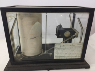 空盒气压计是自动、连续记录气压变化的仪器。该仪器利用膜盒受大气压力作用所产生的弹性形变,通过传动机构转换为对应的指针转动量来测量气压。通常由五个真空膜盒组成,除机械部分外,还有自计钟、自计笔、自计纸等部件。空盒气压计的示值往往是不准确的,若要在记录纸上查询气压数值时用于业务,应结合水银气压表或数字气压计进行比较观测,以进行修正。