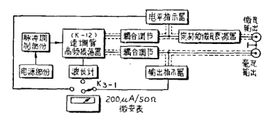 原理概述:XFL-6型厘米波信号发生器,以K-12反射速调管作为震荡管,和同轴型外谐振腔构成单回路的振荡器。利用K-12速调管电子群聚过程,激发震荡,谐振腔工作于3/4(TEM)线长度,由它产生需要的频率。功率和一定形状的高频调制信号。为能达到广泛测量的需要,仪器在电路设计上还配置了波长计,衰减器,调制器,功率输出指示系统等辅助电路。仪器的方框图如图所示。