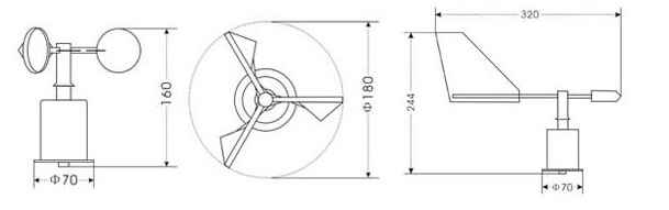 风速传感器采用传统三风杯结构,风杯选用碳纤维材料,强度高,启动好;风向传感器采用精密电位器,并选用低惯性轻金属风向标响应风向,动态特性好。杯体内置的信号处理单元可根据用户需求输出相应信号。风杯和风向标尾翼板用轻质高强度非金属材料制造。它的动态性能好、线性精度高、灵敏度高、测量范 围宽、互换性好、抗风强度大,电路抗雷电干扰能力强,寿命长、工作可靠。