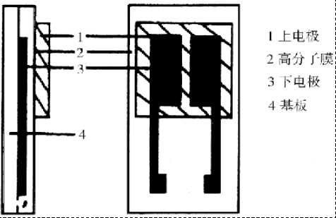 湿敏电容湿度传感器是用有机高分子膜作介质的一种小型电容器,湿敏电容器的上电极是一层多孔金属膜,能透过水汽;下电极为一对刀状或梳状电极,引线由下电极引出,基板是玻璃,整个感应器是由两个小电容器串联组成。