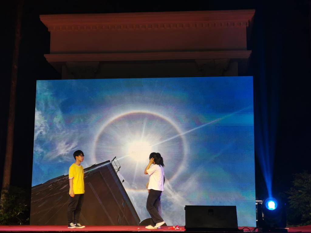 结合时势,话剧展演时还灵活增加了最近成都出现了几次的日晕现象,给观众详细科学地解释了产生日晕现象的原理。话剧结尾还以今年年初各地的雹灾为背景,科普了雹灾现象、如何预防、如何自救等知识。
