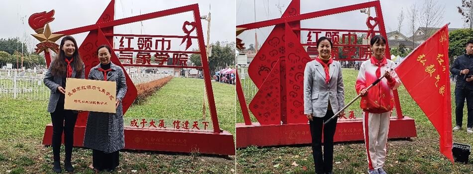 在红领巾气象学院授牌仪式上,刘琰琰为树德实验中学弘毅分校成立“成都市红领巾气象学院树德弘毅实践教学点”授牌,缪燕平为树德实验中学弘毅分校校园气象站第一任小站长杨子溢同学授“红领巾气象学院弘毅气象科普小分队”队旗。