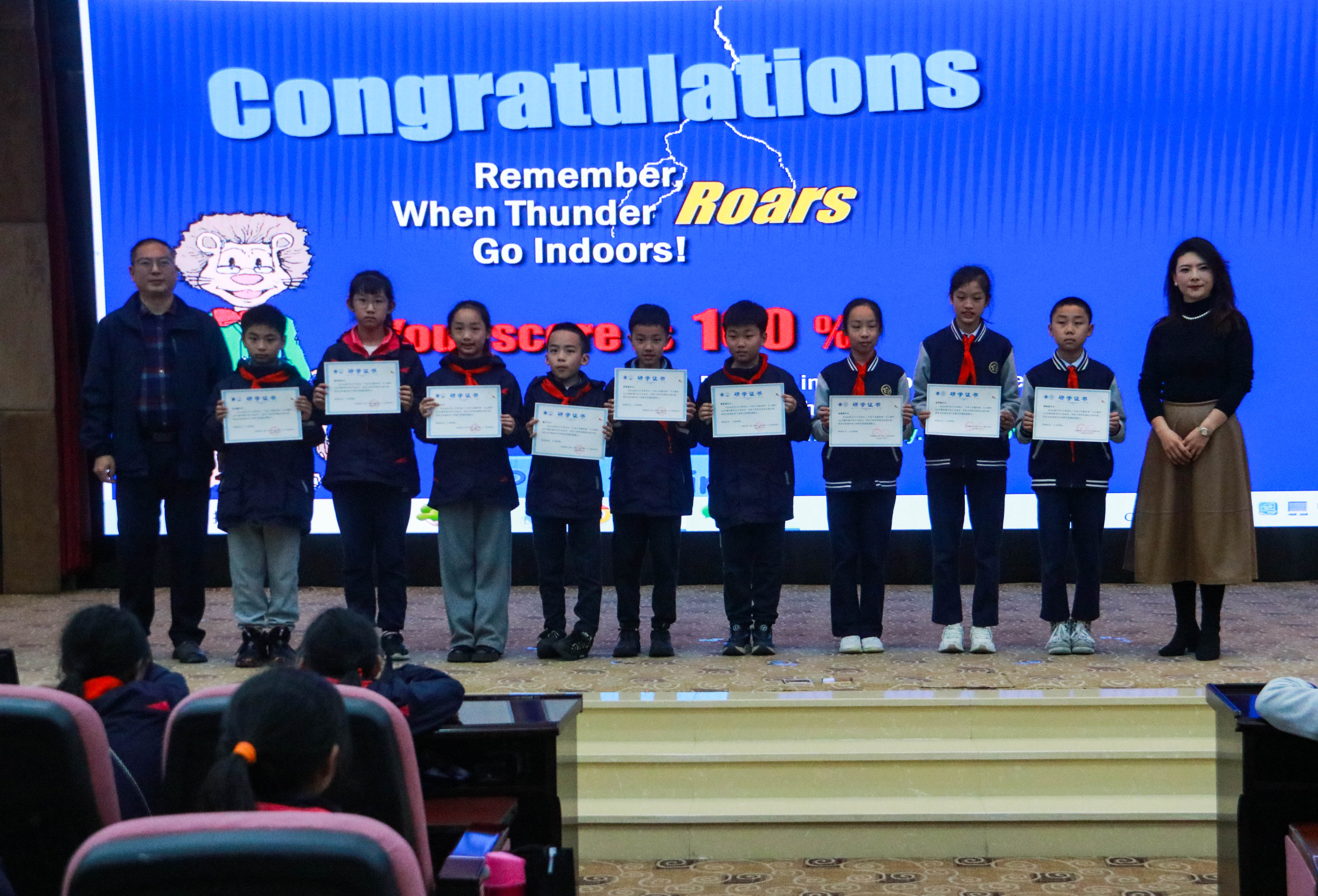 活动结尾,大气科学学院党委书记刘琰琰、电子工程学院(大气探测学院)党委副书记杨勇为双流实验小学成都圣菲小学学生代表颁发研学证书并全体合影。