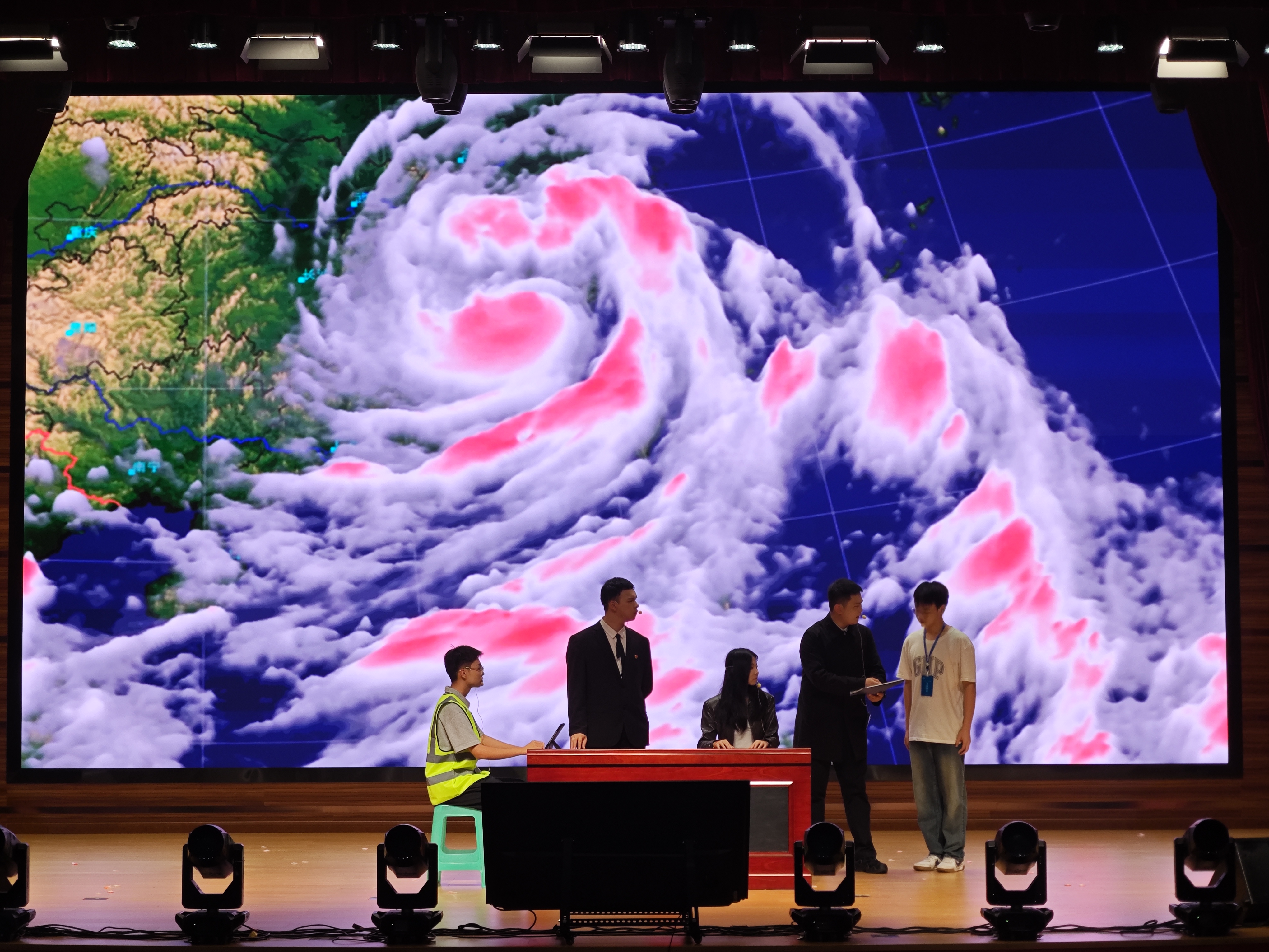 《风云十二时辰》是一部围绕台风“海神”预警及应对展开的话剧。剧中,12位气象相关人员在台风来袭的十二时辰内,在市气象指挥中心、无人机指挥舱、老龙头渔港等不同场景,展开数据与经验、传统与现代的激烈博弈。他们通过手绘天气图、量子计算器、双偏振雷达、北斗短报文系统等手段,整合多源数据,克服预报难题,最终精准预警,守护了沿海三镇安全。