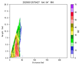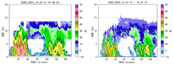海口反射率强度PPI(左)和海口反射率强度RHI(右)